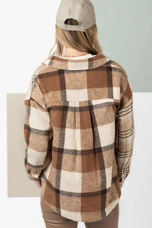 Love Salve Beige Plaid Flannel Shacket Women's Casual Winter Top: Soft & Stylish