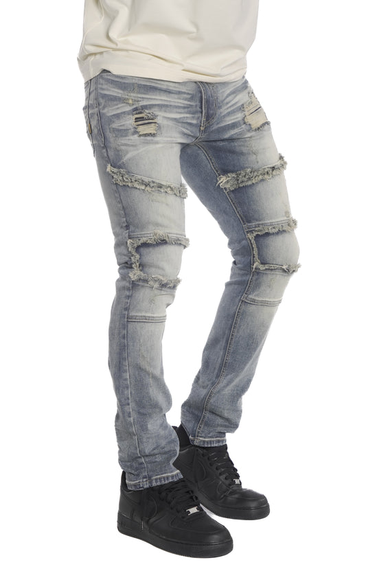 M1798 Makobi Biker Jeans with Blasting & Repair Stitching - Vintage Wash