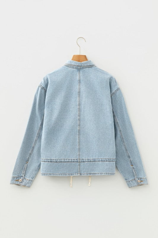 Light Wash Denim Drawstring Hem Buttoned Jacket