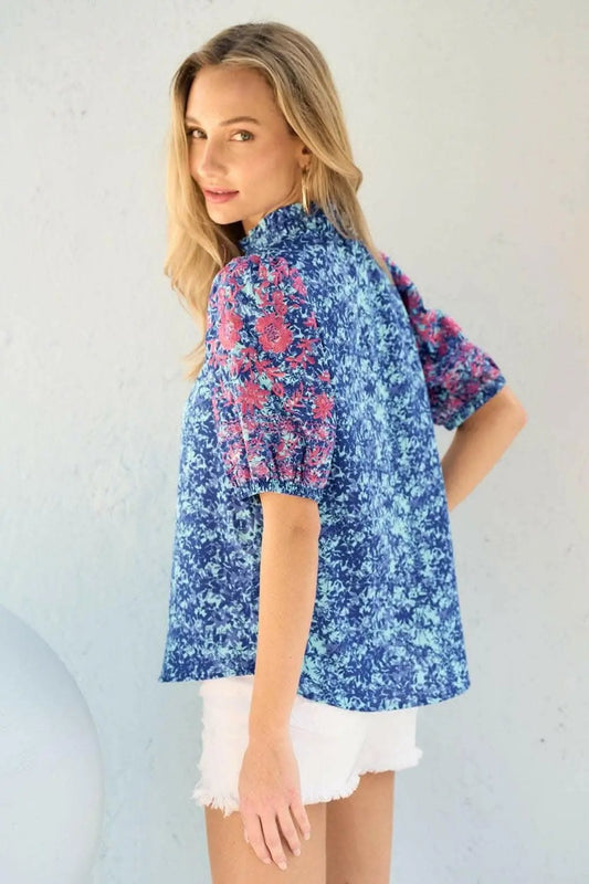 Women's Blouse - Embroidered Puff Sleeve - Casual