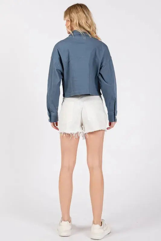 Denim Cropped Jacket - Button Down with Pockets - Casual Trendy