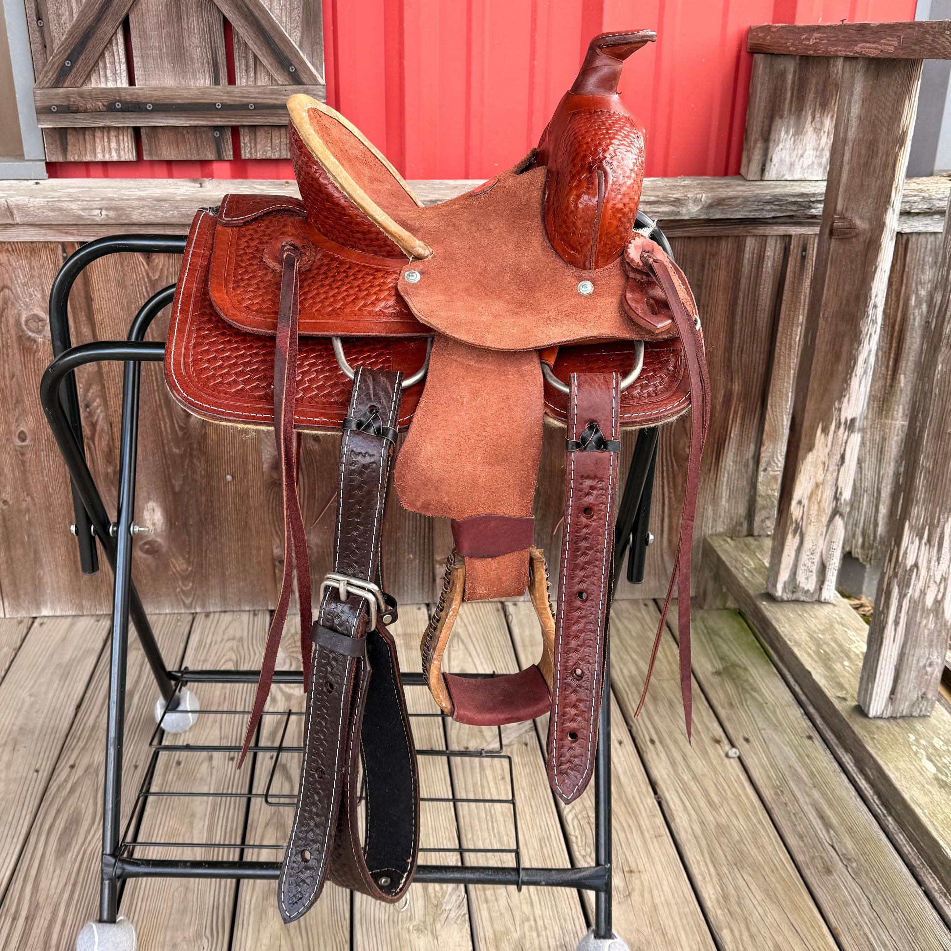 New 10" Buffalo kids Saddle features basket tooling, roughout jockey and fender, pencil roll hard seat, saddle strings, fleece lining, back cinch included