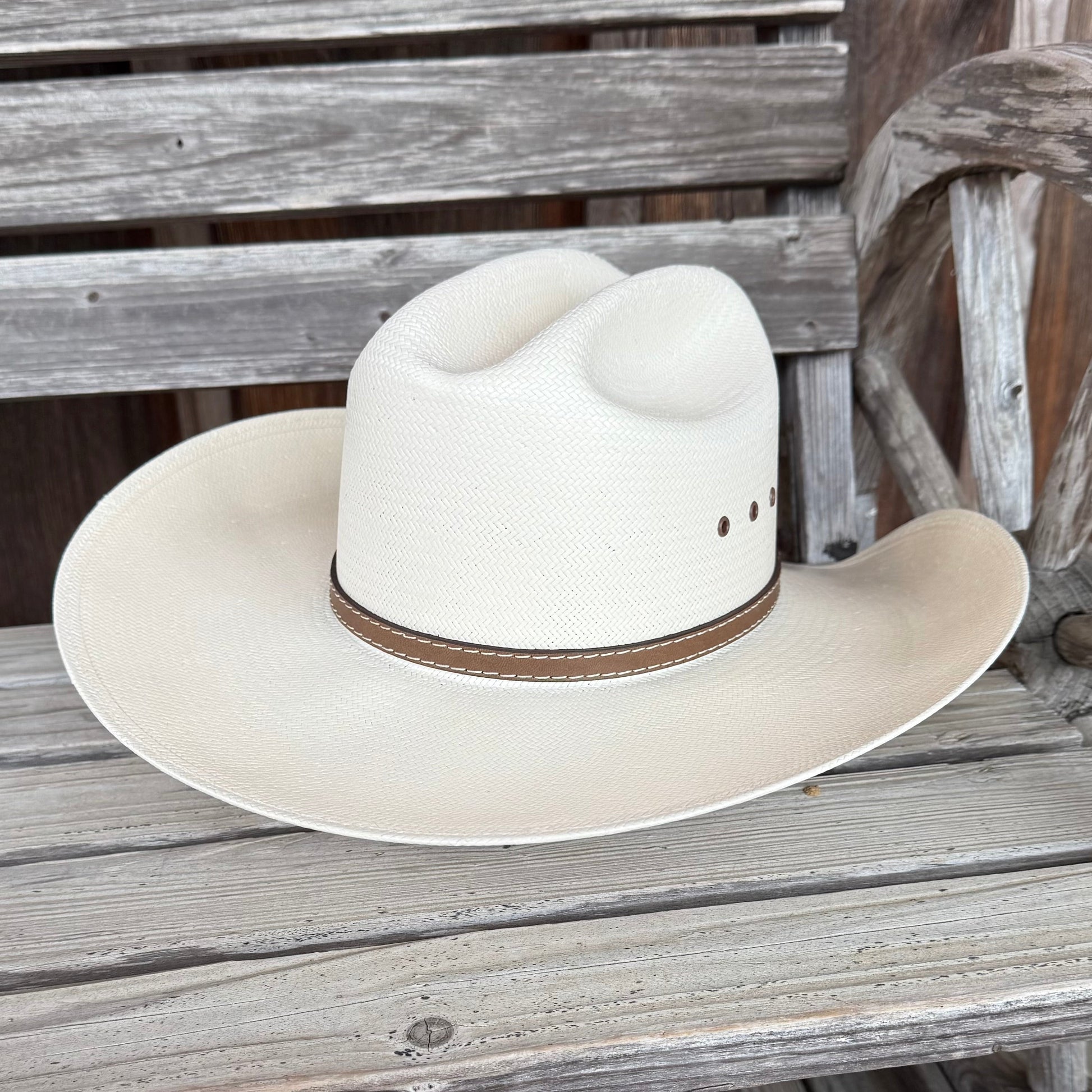 10X Double Cross George Strait straw hat with a 4 1/8” cattleman’s crown, a 4 1/4” brim, with a leather sweatband. The hatband is chocolate brown with white stitchwork and has a Resistol 1927 pendant on the right-hand-facing side. Eyelets provide ventilation