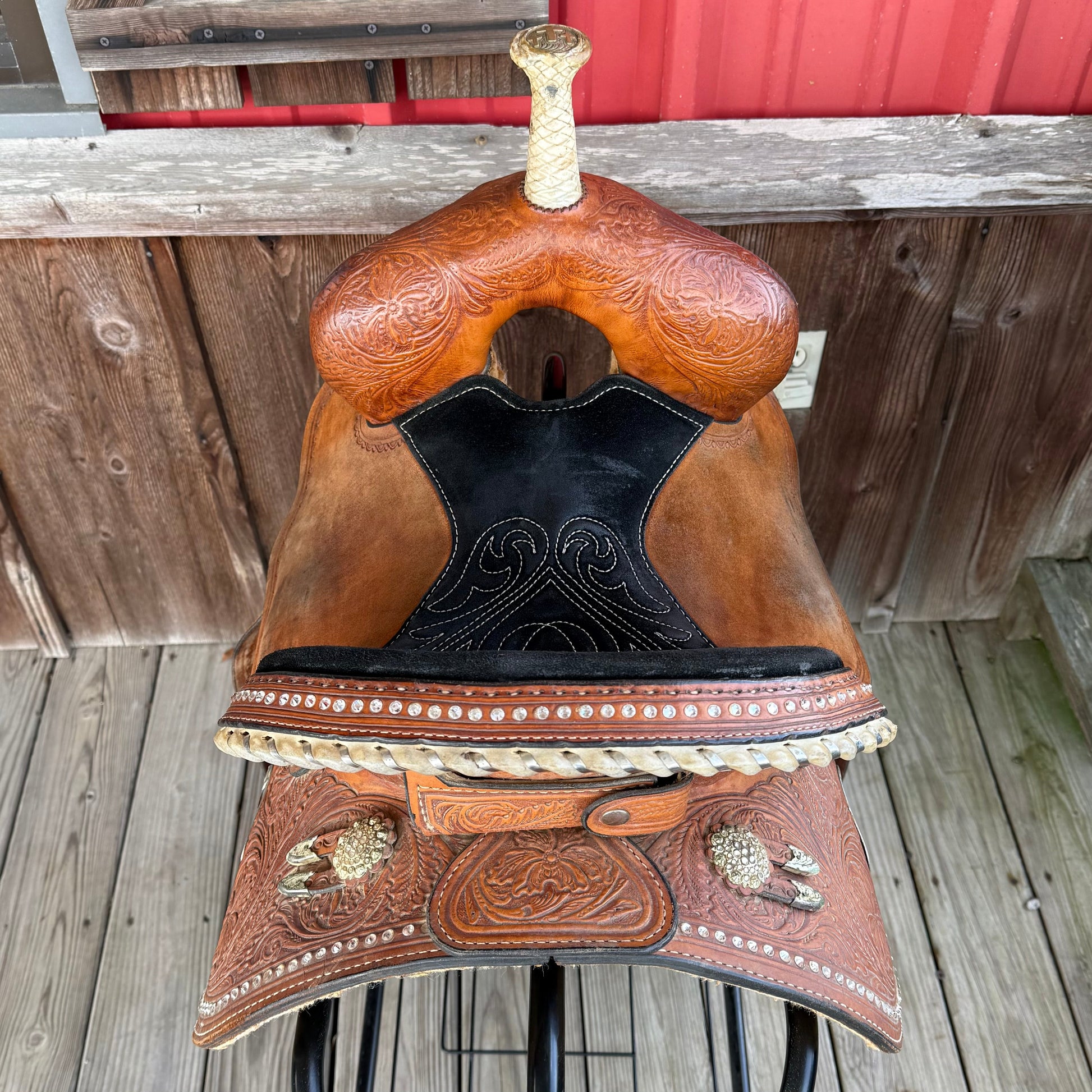 Used 14" Martha Josey Ultimate by Circle Y barrel saddle, standard fit, roughout jockey and fender with a border tooling, fully tooled skirt and pommel with crystal on border, black suede seat, fleece lined, forward ride fenders