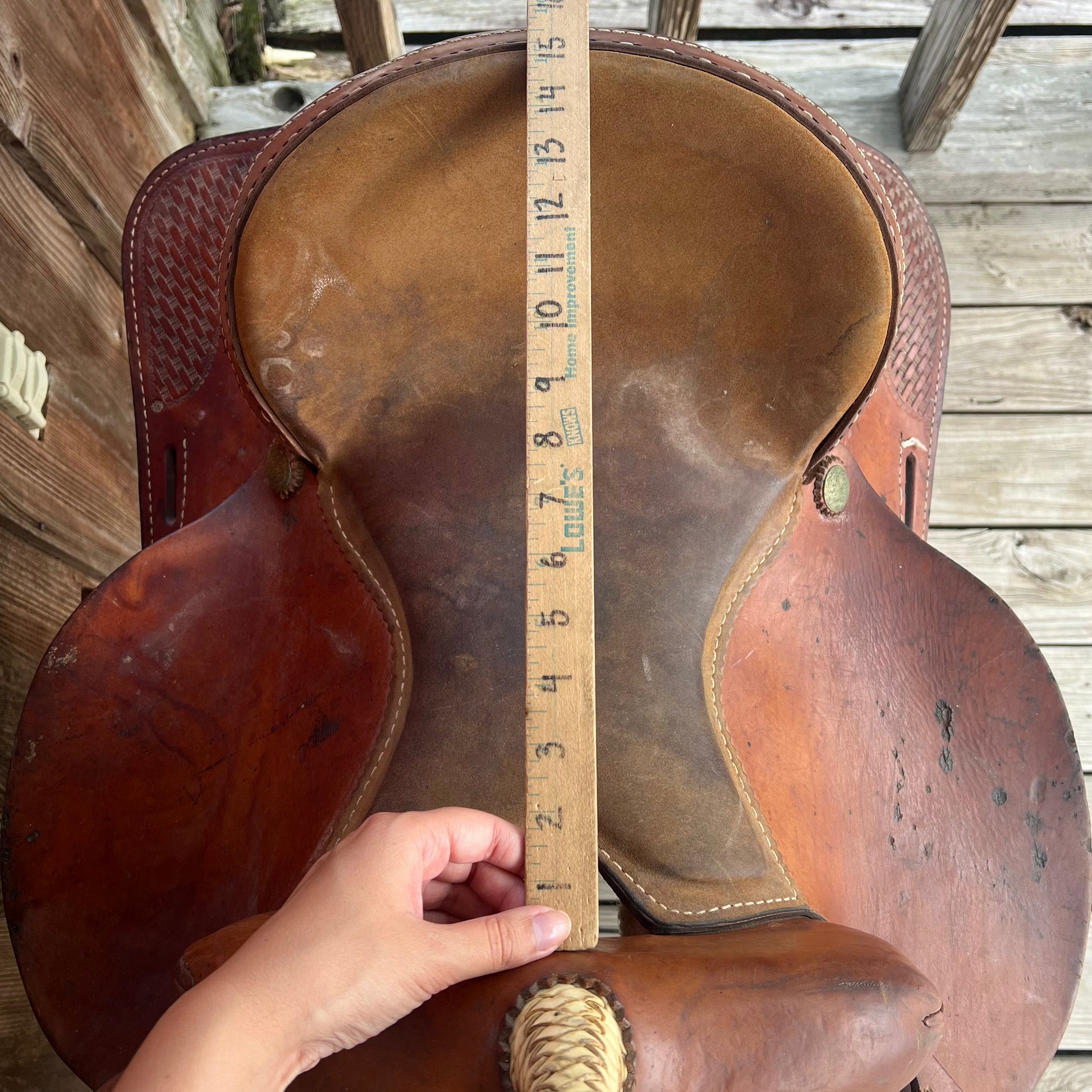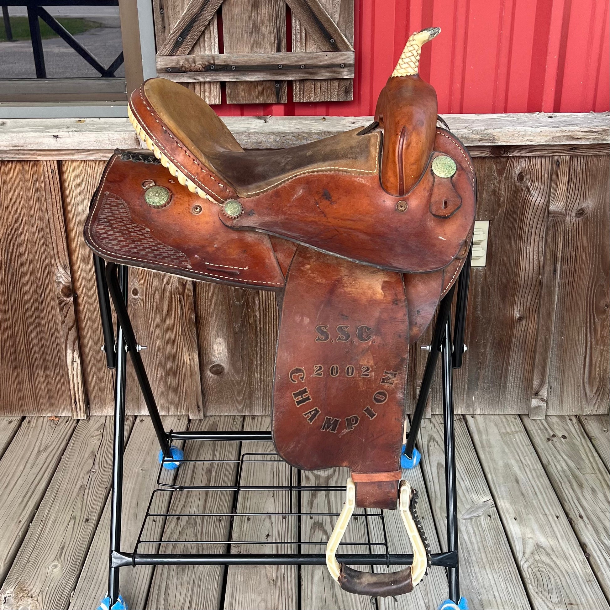Used 15" Dakota barrel saddle, suede padded seat, basket weave tooling on corner of skirt, rawhide horn, fleece line, "S.S.C 2002 CHAMPION" on fender