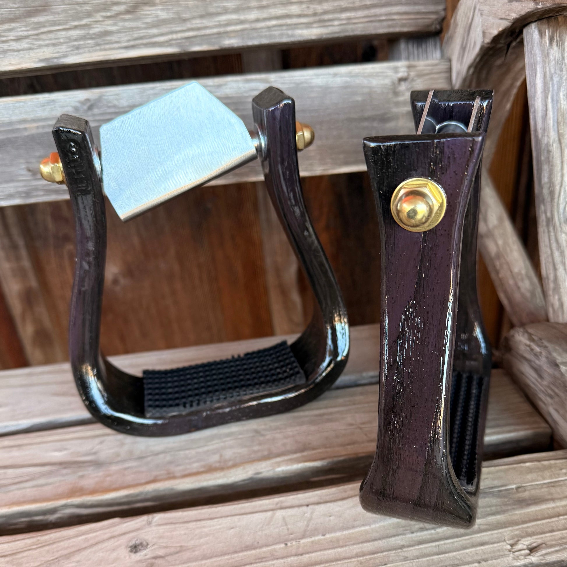 2" Nettle barrel racer stirrups black and painted purple with the leveler system and rubber grips on foot part