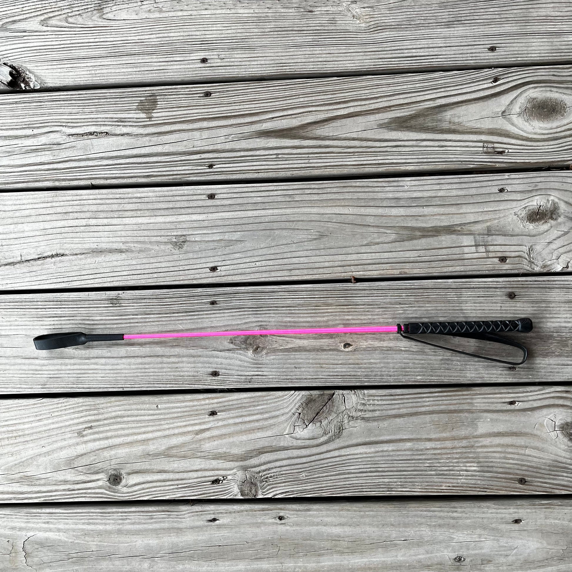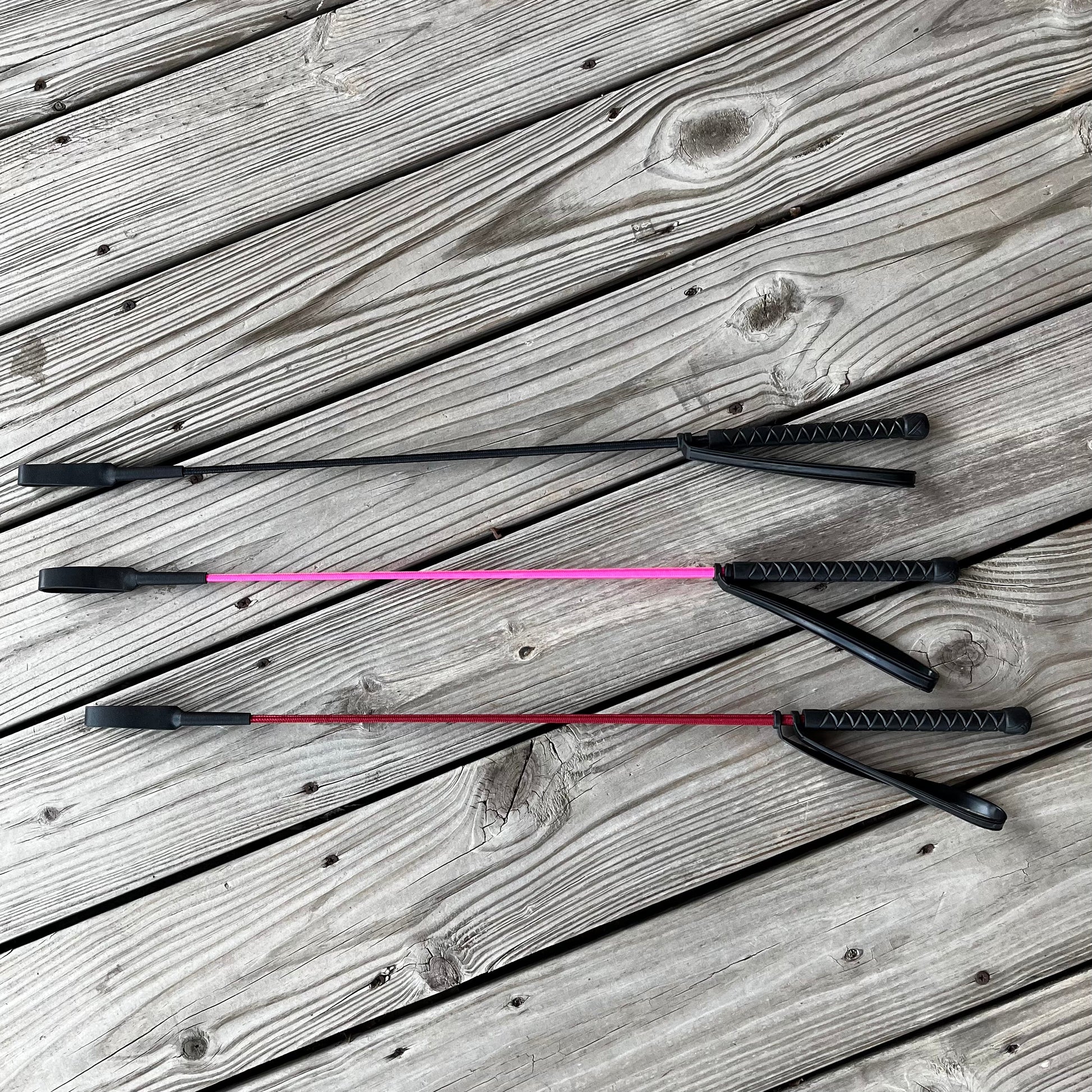 26" riding crop with rubber coated handle and rubber wrist strap and a 2" popper