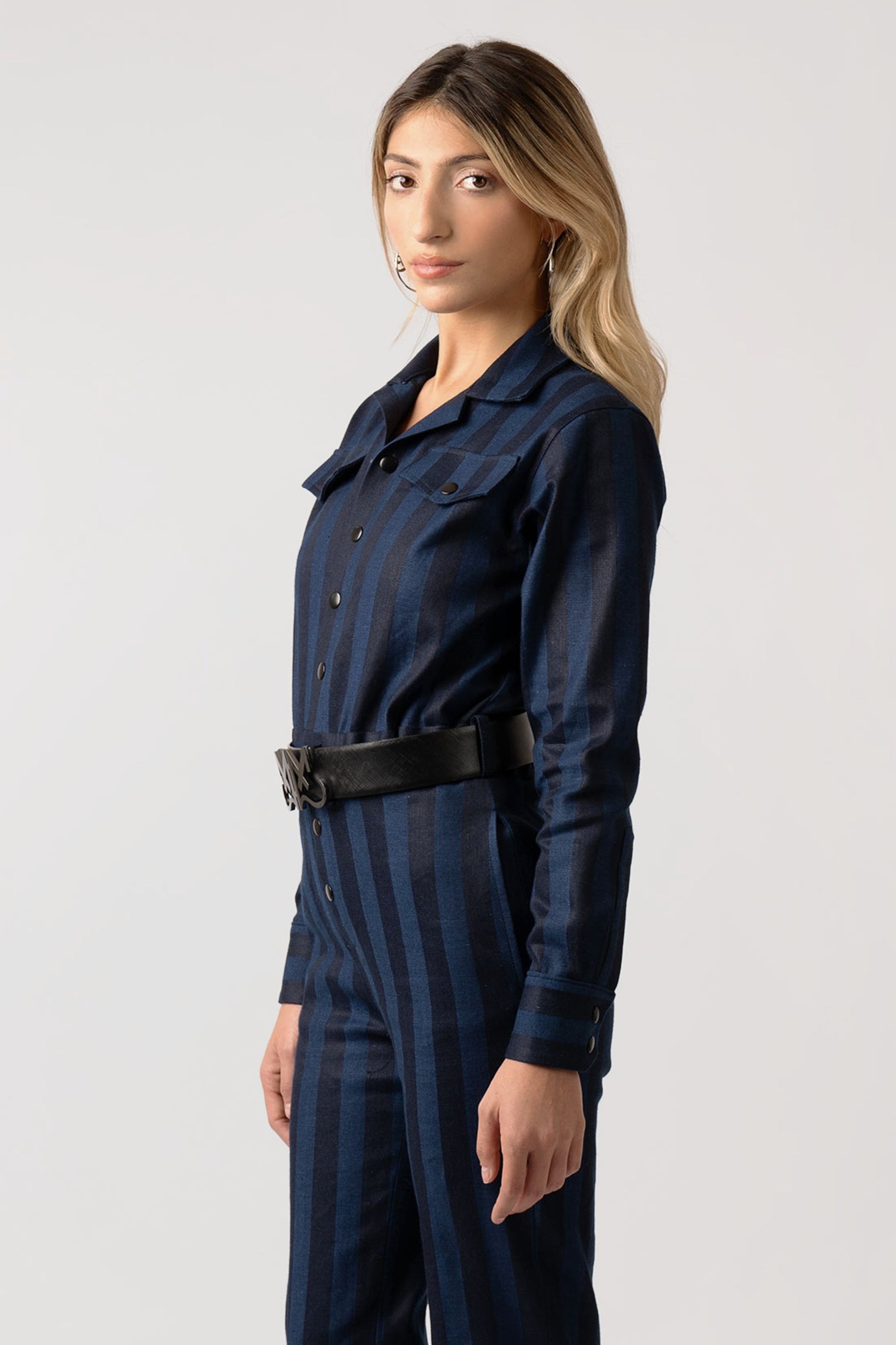 The Adriana Striped Dark Blue Jumpsuit blends modern tailoring with relaxed, elevated style. Crafted from premium cotton in muted Yale and Space Cadet blue stripes, this jumpsuit features a snap button front and an ingrained stretch waistband for a flattering, all-day comfortable fit. Perfect for daytime events, evening outings, or casual-chic moments, its versatile silhouette makes it ideal for office-to-evening transitions or editorial-worthy street-style looks.