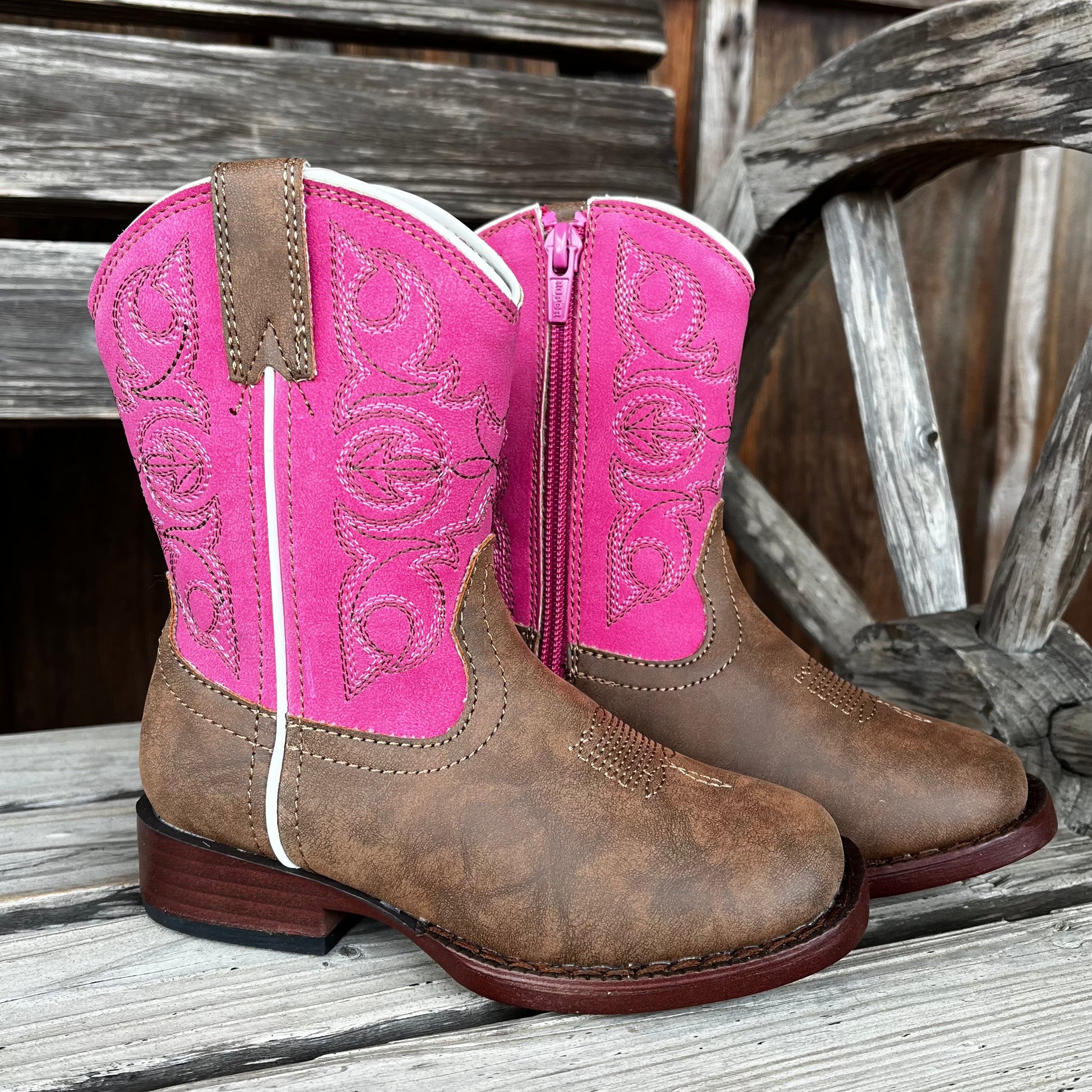 Roper girls infant and toddler boots. Brown bottoms with pink tops. All sizes have a side zipper for easy access.