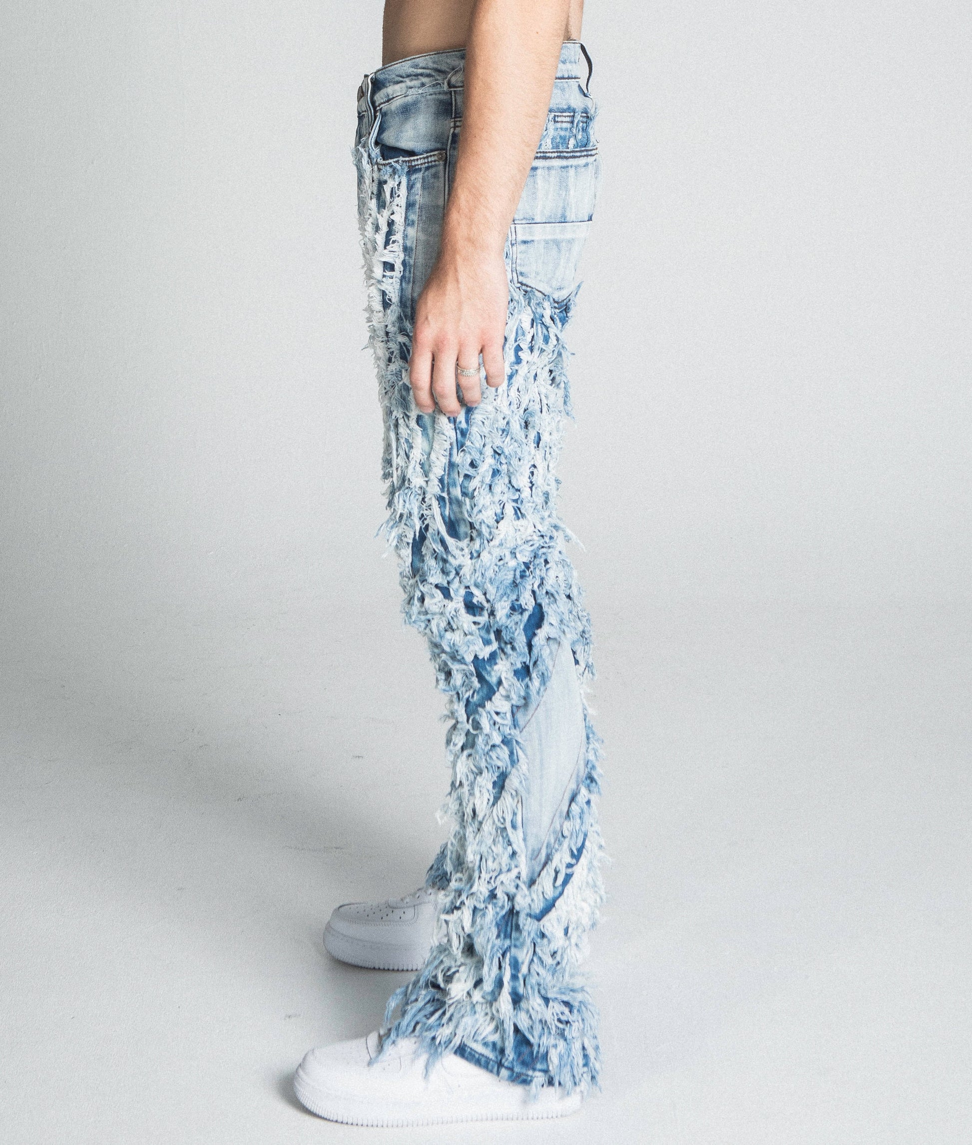 WAIST: Mid riseFABRIC: StretchyTraditional wash stacked leg jeans with extreme frayed design, belt loops, and a zipper fly and top button fastening. Made from cotton.
