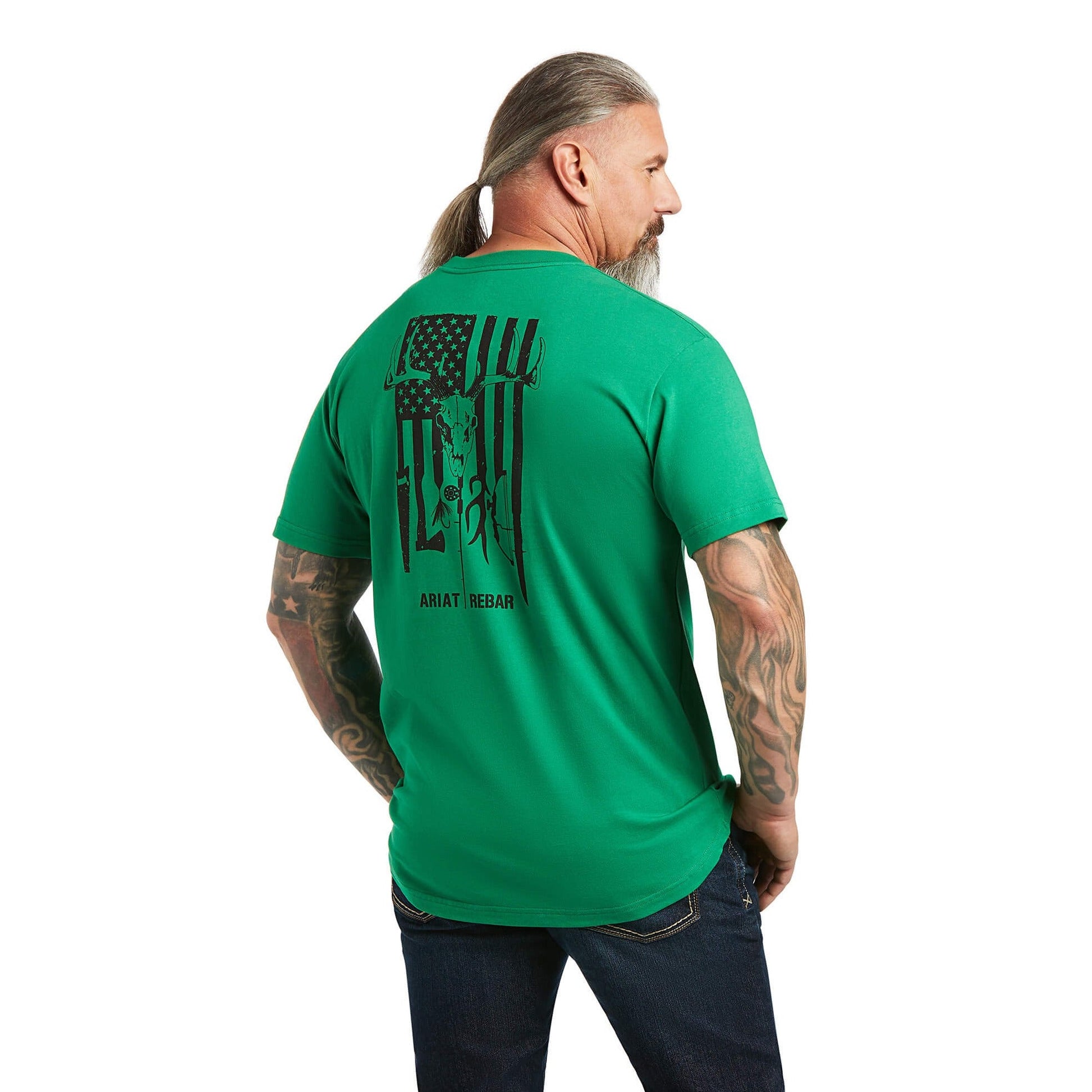 Ariat green short sleeve t-shirt American Outdoors / flag and skull graphic Pre-shrunk. 60% cotton, 40% polyester