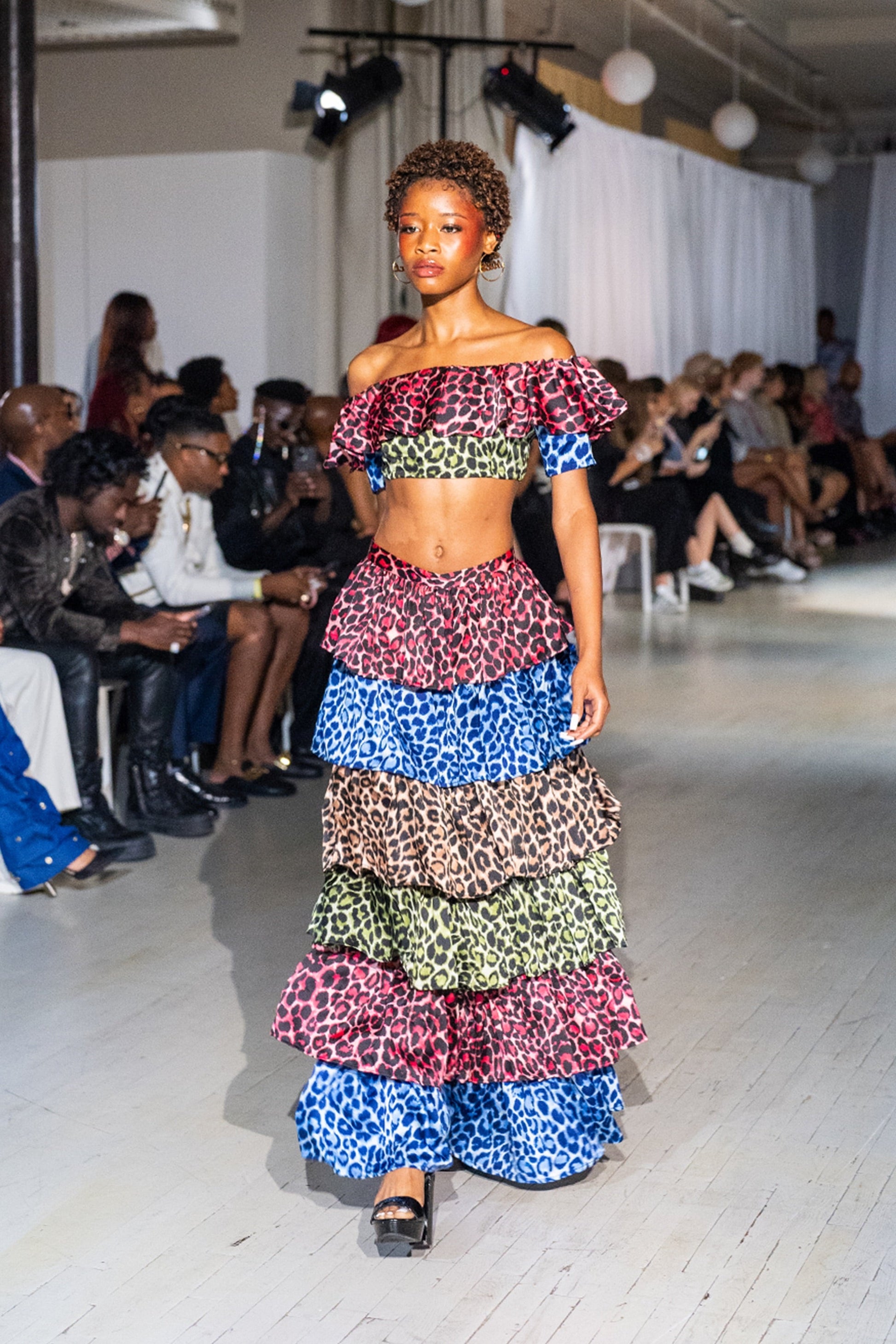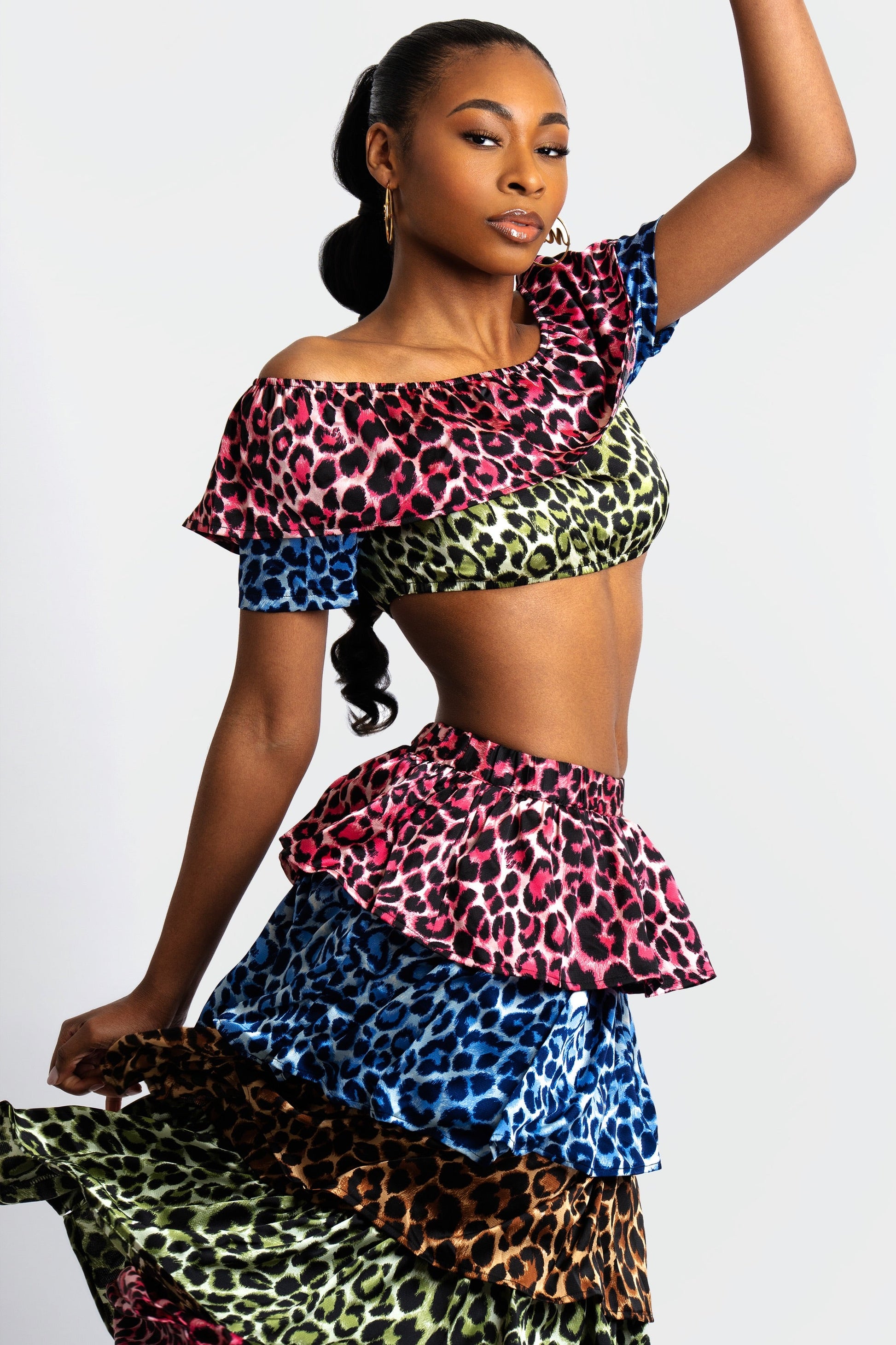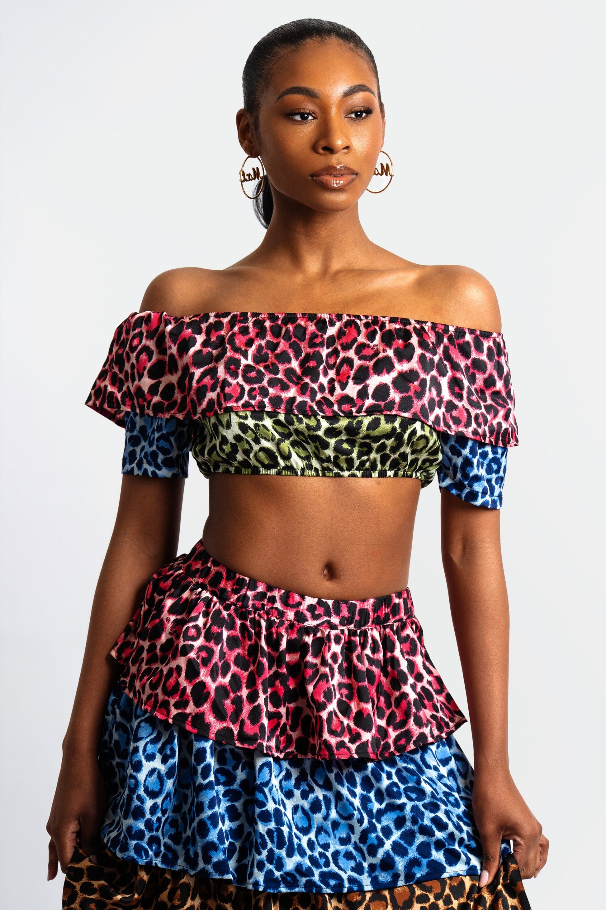 The Ana Ruffled Cheetah Print Skirt Set is a playful, statement-making ensemble that exudes high-impact style. Crafted from lightweight, breathable fabric, the set features an off-the-shoulder crop top with cascading ruffles and a tiered maxi skirt that flows with every step.