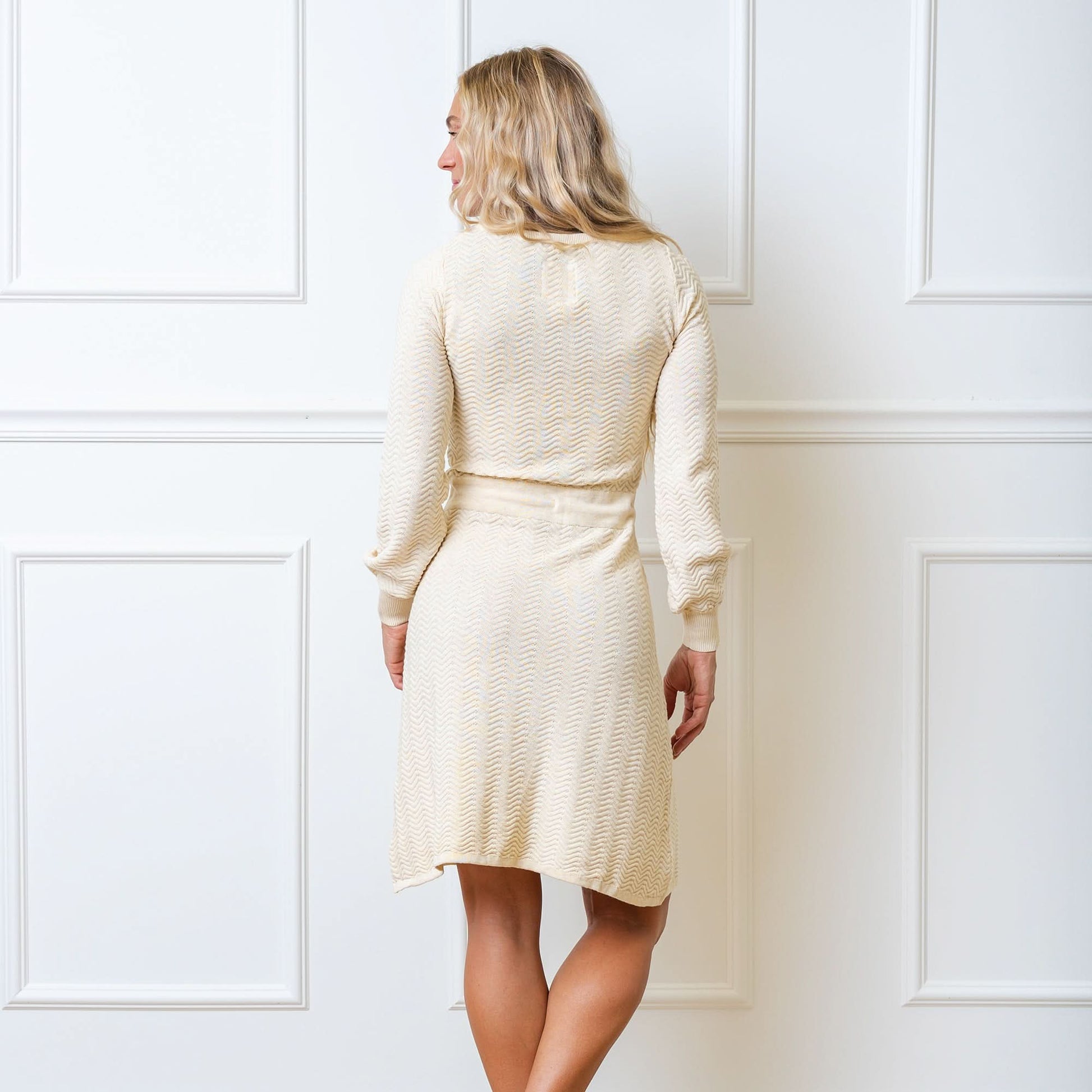 Infinitely cozy with an easy silhouette and gently bellowed sleeves, our scoop neck sweater dress is a cool weather staple in soft organic cotton. Features a refined allover chevron stitch and a rib knit waistband with waist ties. This winning piece is sure to take you from one season to the next!