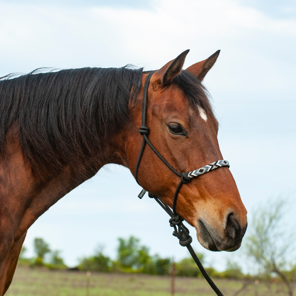 Black Beaded aztec noseband rope halter with attached 9' lead rope