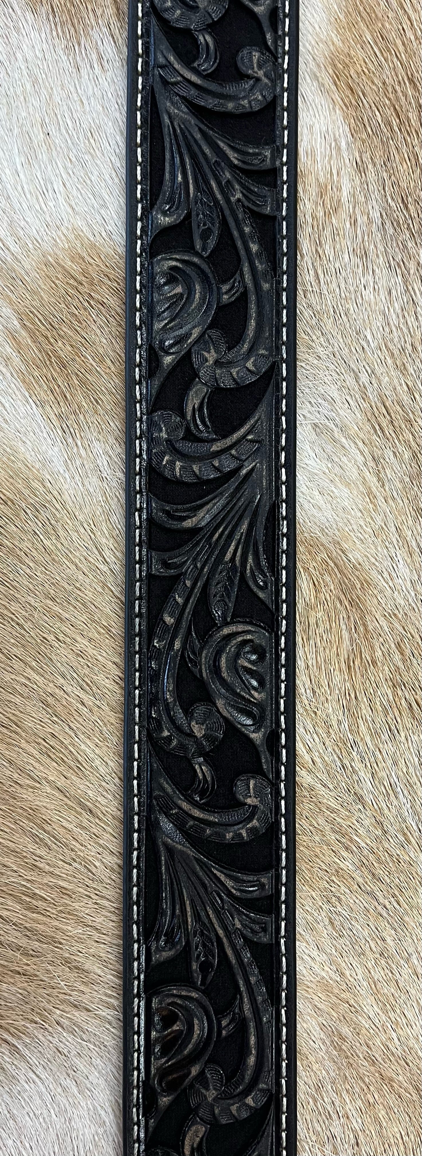This genuine leather belt measures 1 1/2" wide and features an Ariat floral tooled distressed black buck lace design.