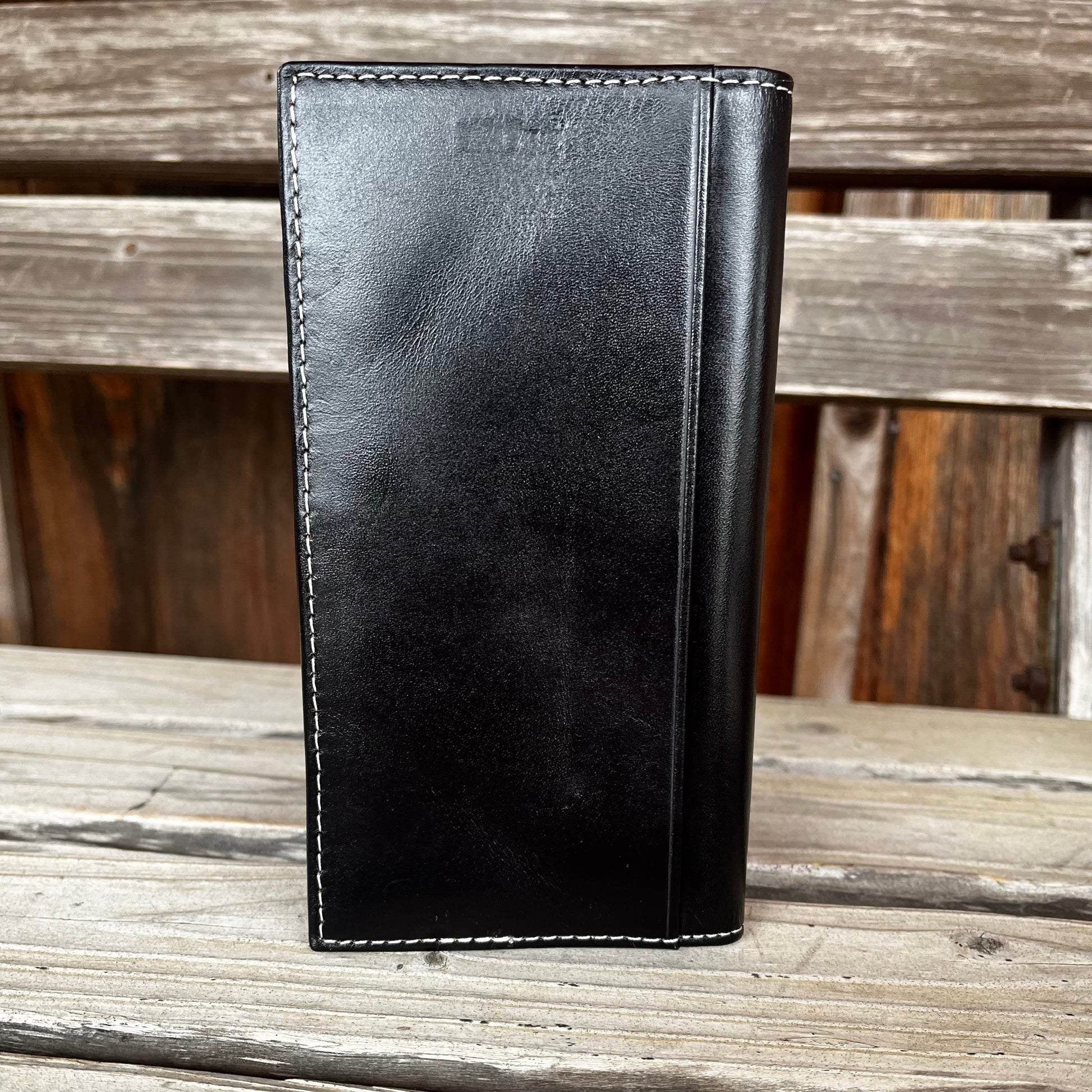 This Ariat rodeo wallet Floral embossed body with multi finish Ariat shield concho. Multiple card and cash slots, checkbook slot and ID window on the inside. Genuine leather