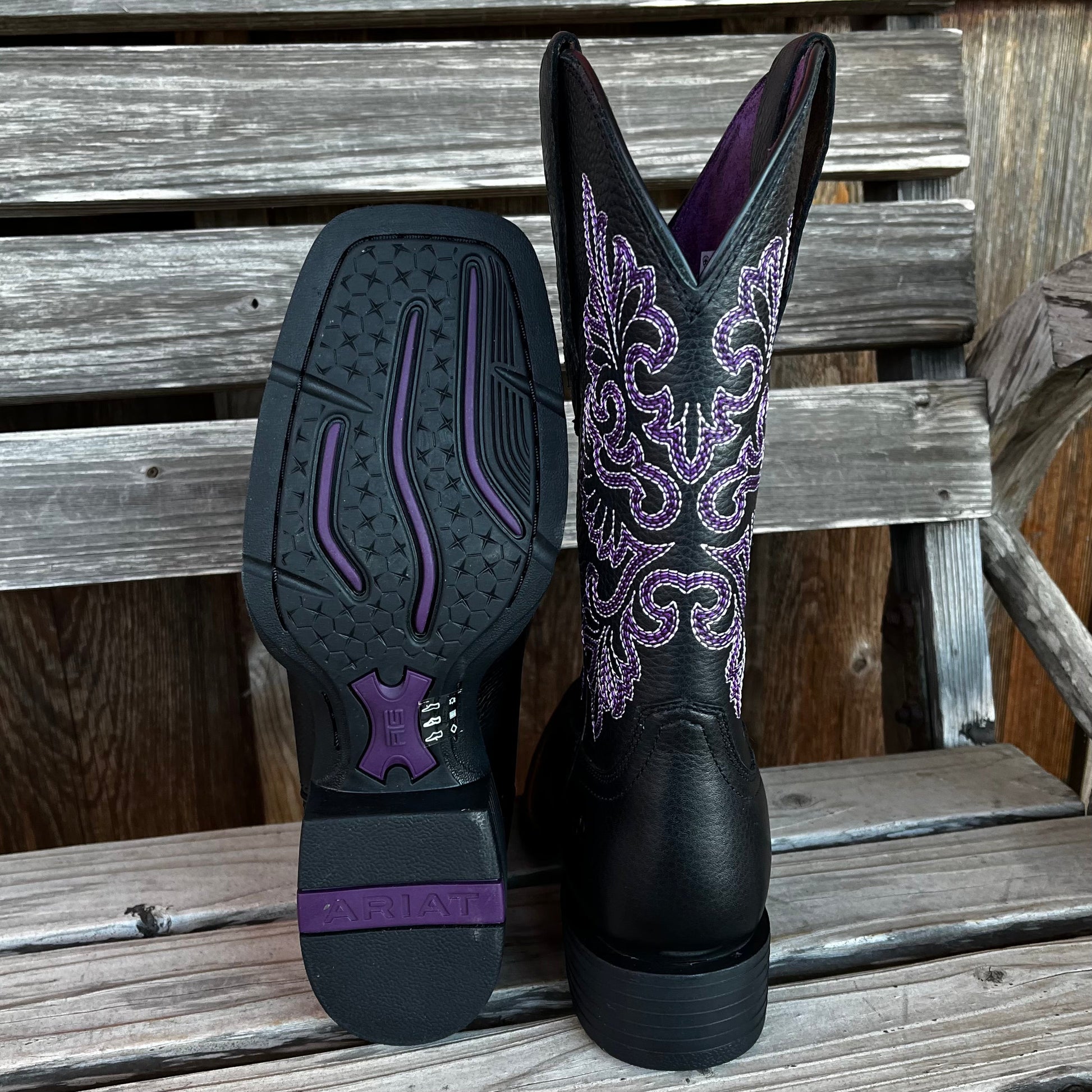 Women's Ariat black wide square toe boots with purple stitching in the shaft and a rubber sole. ATS technology, StretchFit panels under the pull tabs give an additional inch to fit a wide range of calves, Duratread sole. 11" shaft height, 1.375" heel height, Wide square toe