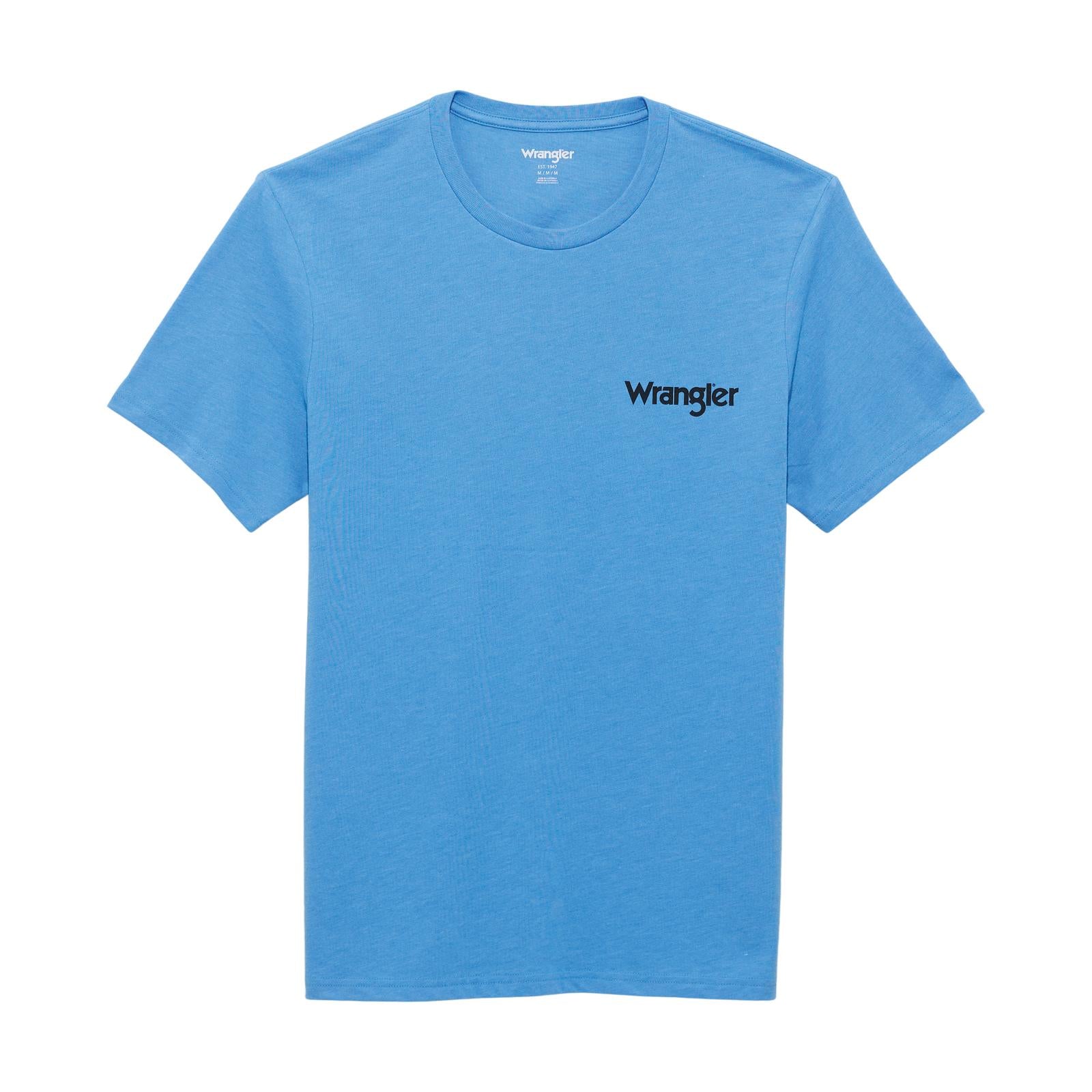 Men's Blue T-Shirt with an American Flag and a short haired pointer dog on the back. Fabric Description: 50% Cotton / 50% Polyester