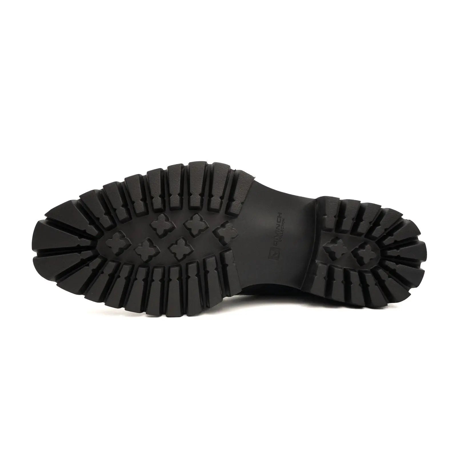 The elegance of the upper is deliberately contrasted with the aggression of the sole. The refined apron/stitched toe detail offers a sophisticated, subtle touch of bespoke craftsmanship, ensuring the boot’s polish is undeniable. This sophisticated upper is then grounded by the defining feature: the chunky lug sole.