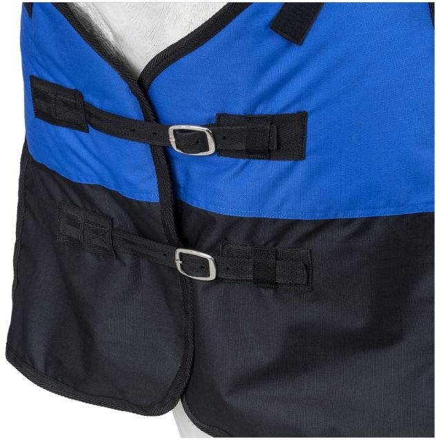 Tough1 Blue Pony blanket. 600 denier waterproof outer shell,250 grams of poly fill for warmth. Single belly surcingle with elastic, Adjustable/replaceable leg straps. Dee rings for optional neck cover attachment