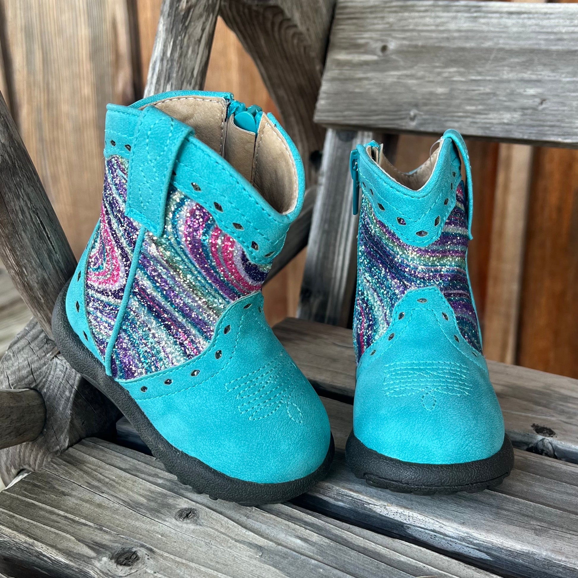 These infant boots feature a blue sole and a glittery shaft decorated with shades of pink, blue, and purple.