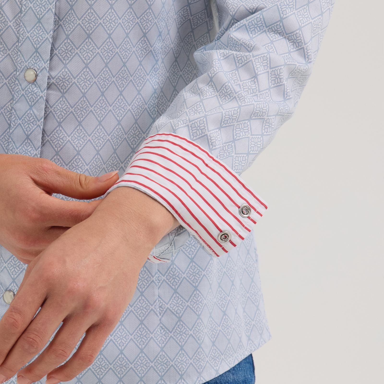 Women's Wrangler long sleeve with snaps in a blue diamond pattern with red and white stripes on the cuff. Fabric Description: 40% Lyocell / 39% Recycled Polyester / 21% Cotton