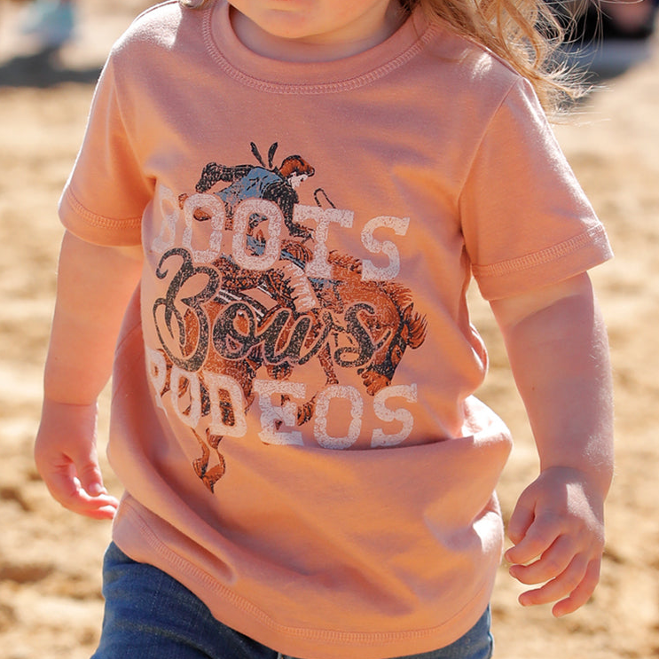 Boots, Bows, Rodeos Toddler pink short sleeve t-shirt with screen print bucking horse, 60% cotton and 40% polyester