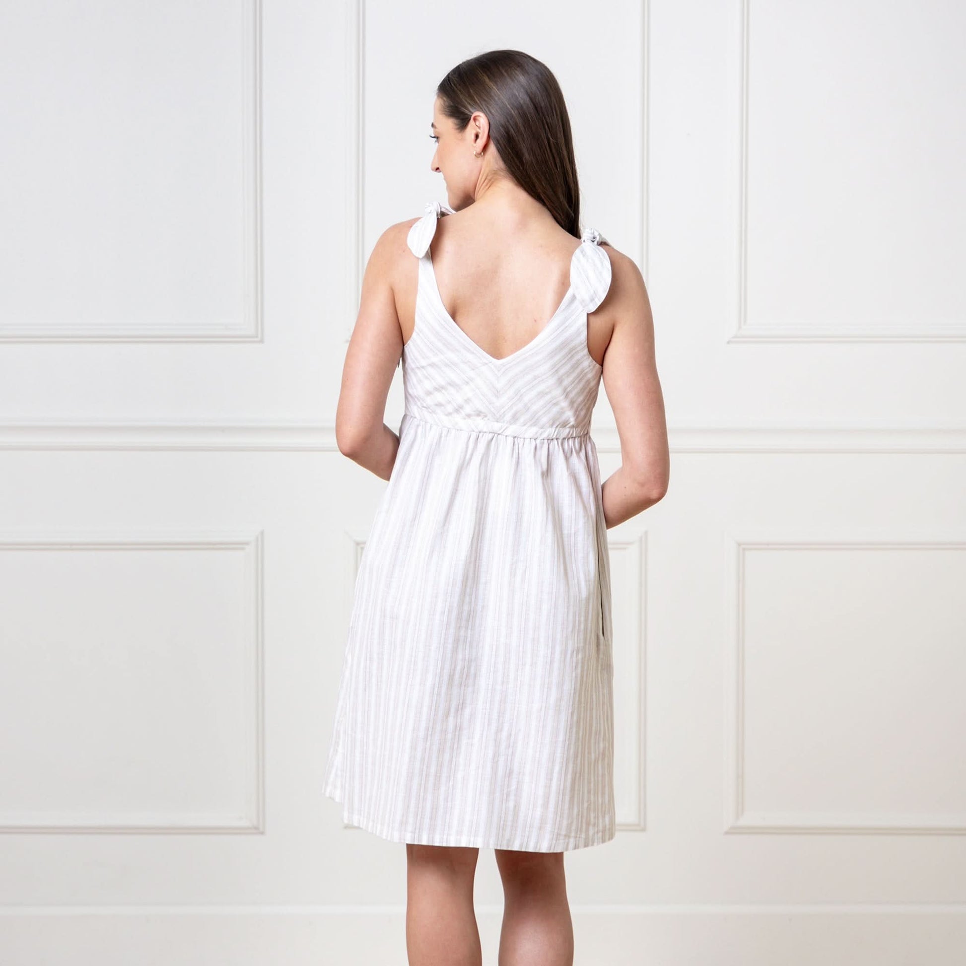 Rock a fresh and fun look in our a-line bow shoulder dress, cut in lightweight organic cotton fabrics for when warm weather hits. Features adjustable bows at the shoulders, a flattering v-neck silhouette, and an invisible side zipper for easy dressing. Fully lined in 100% organic cotton. A lovely silhouette that could be dressed up or down for all that spring and summer brings!