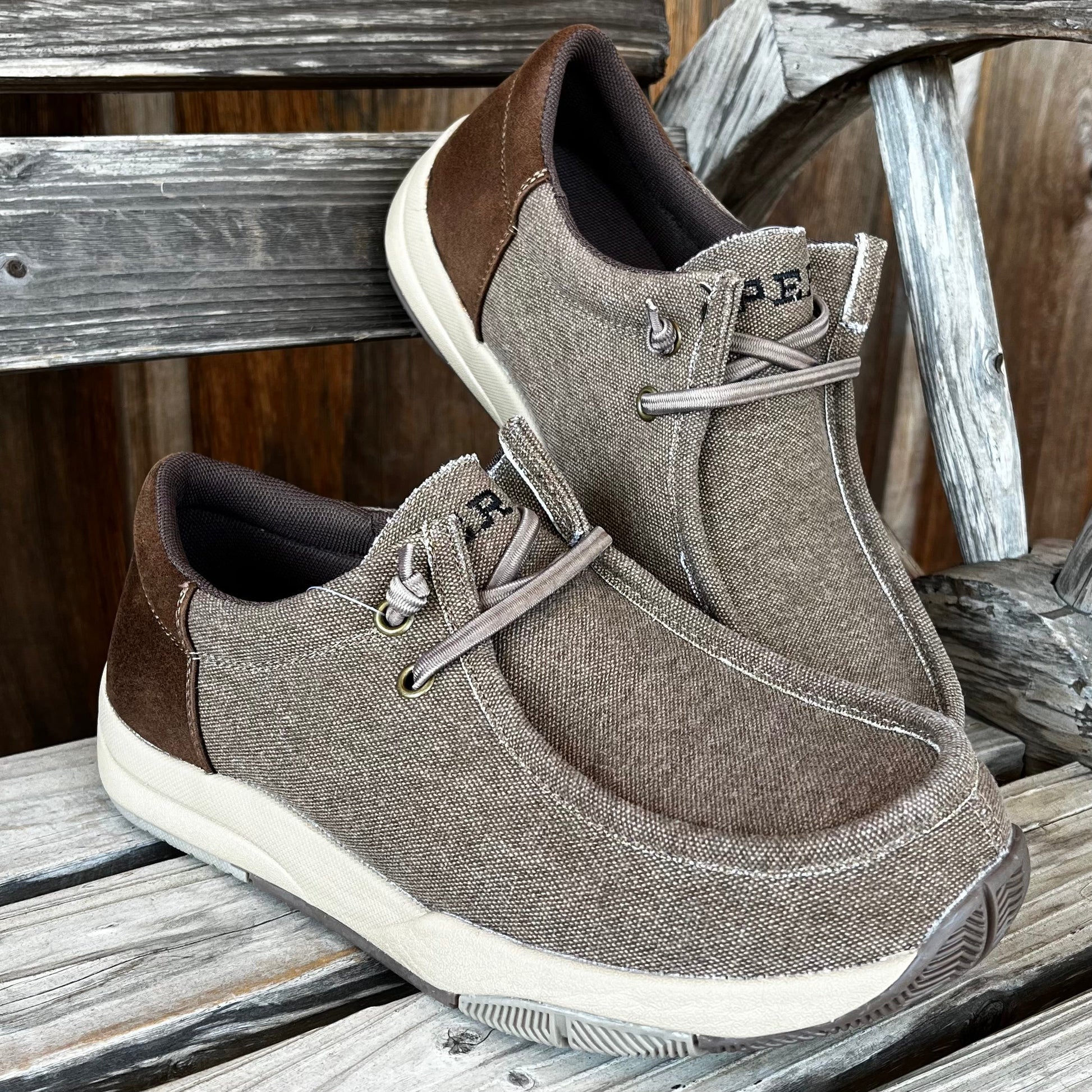 Men's Roper shoe with a light tan canvas body and leather on the back of the heel.