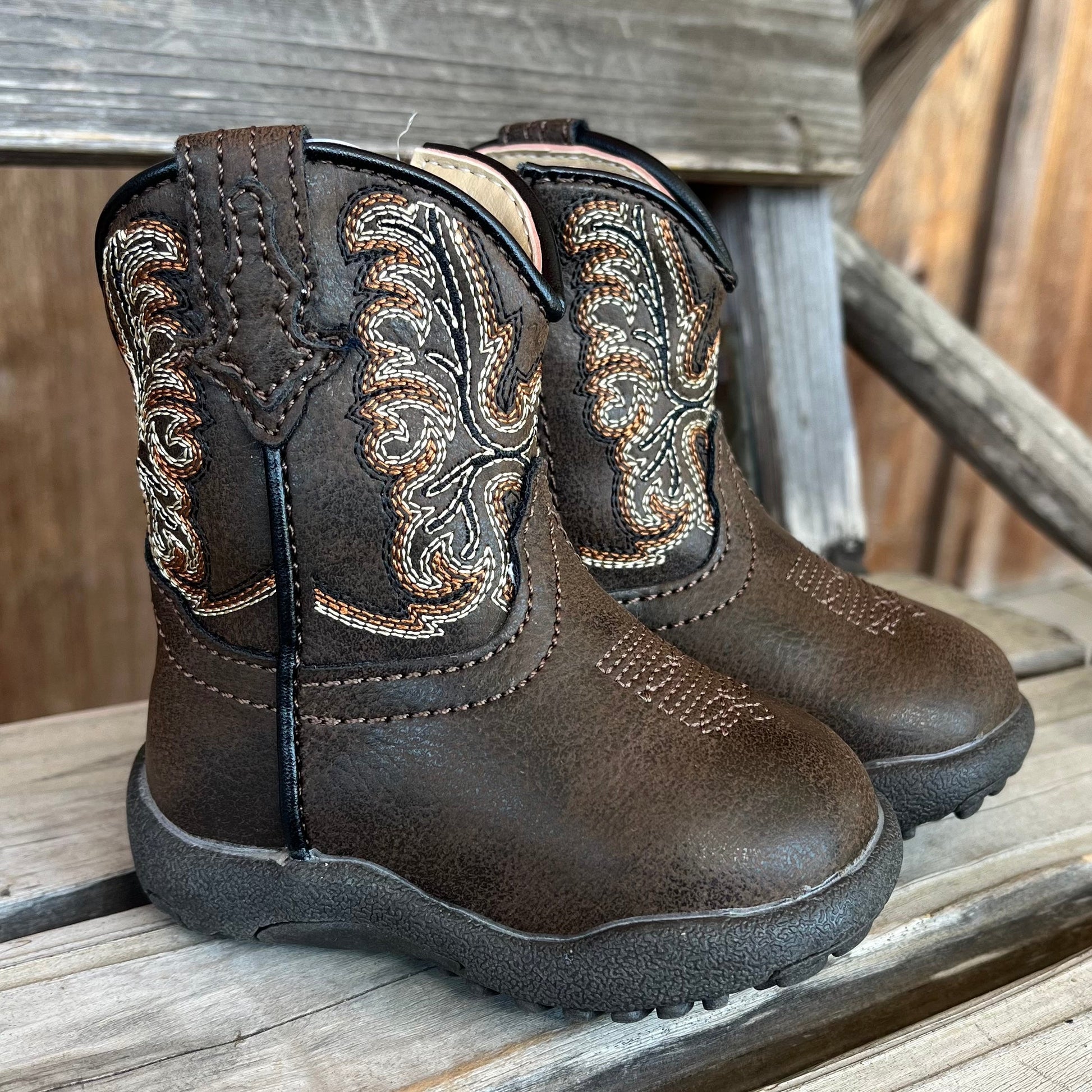 Brown cowbabies with a zipper on the side and rubber bottoms perfect for your little ones.