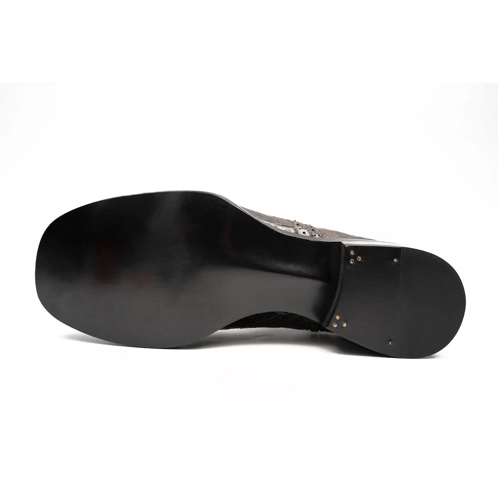 Features an imported Italian leather sole that offers flexibility and durability, molding uniquely to your foot over time. Gold-plated rivets are embedded in key stress areas for structural integrity and subtle luxury.