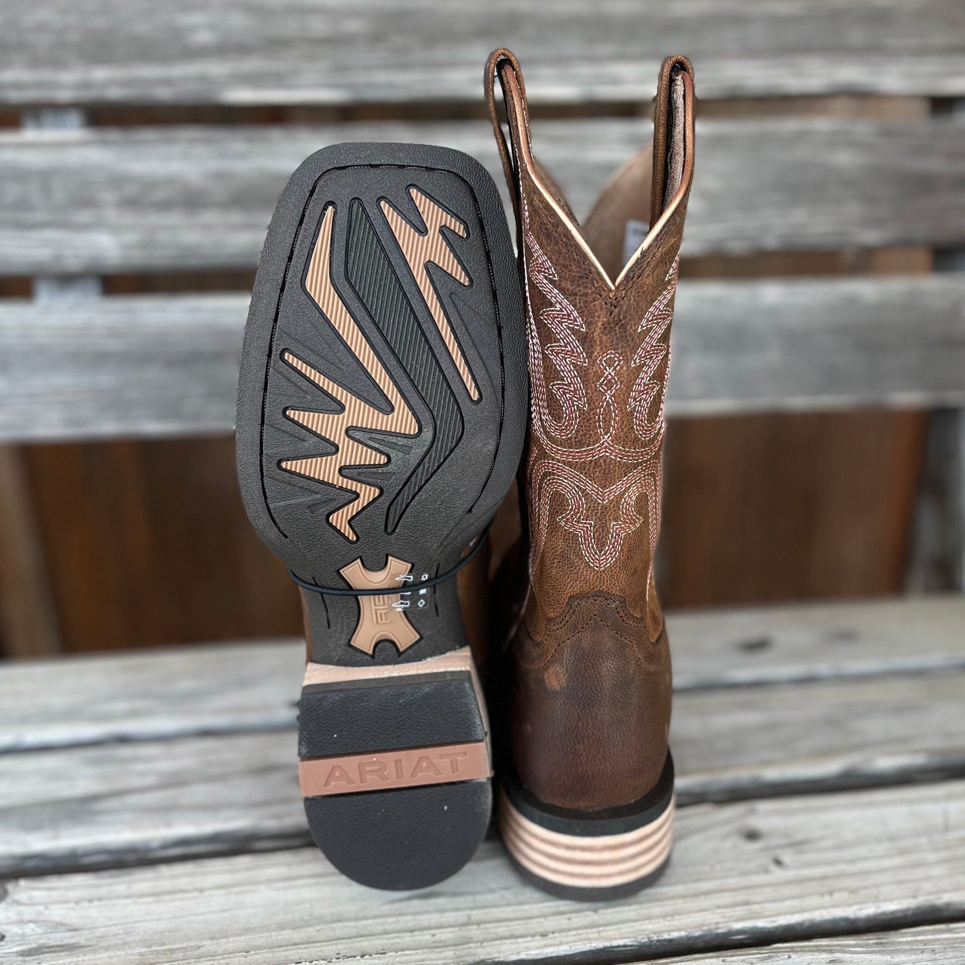Women's Ariat brown square toe boot with light stitching and a rubber sole.