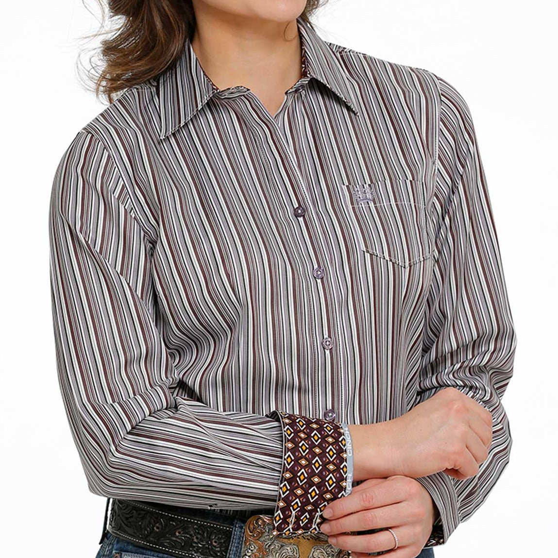 Cinch Women's purple, burgundy, white pin stripe long sleeve button up