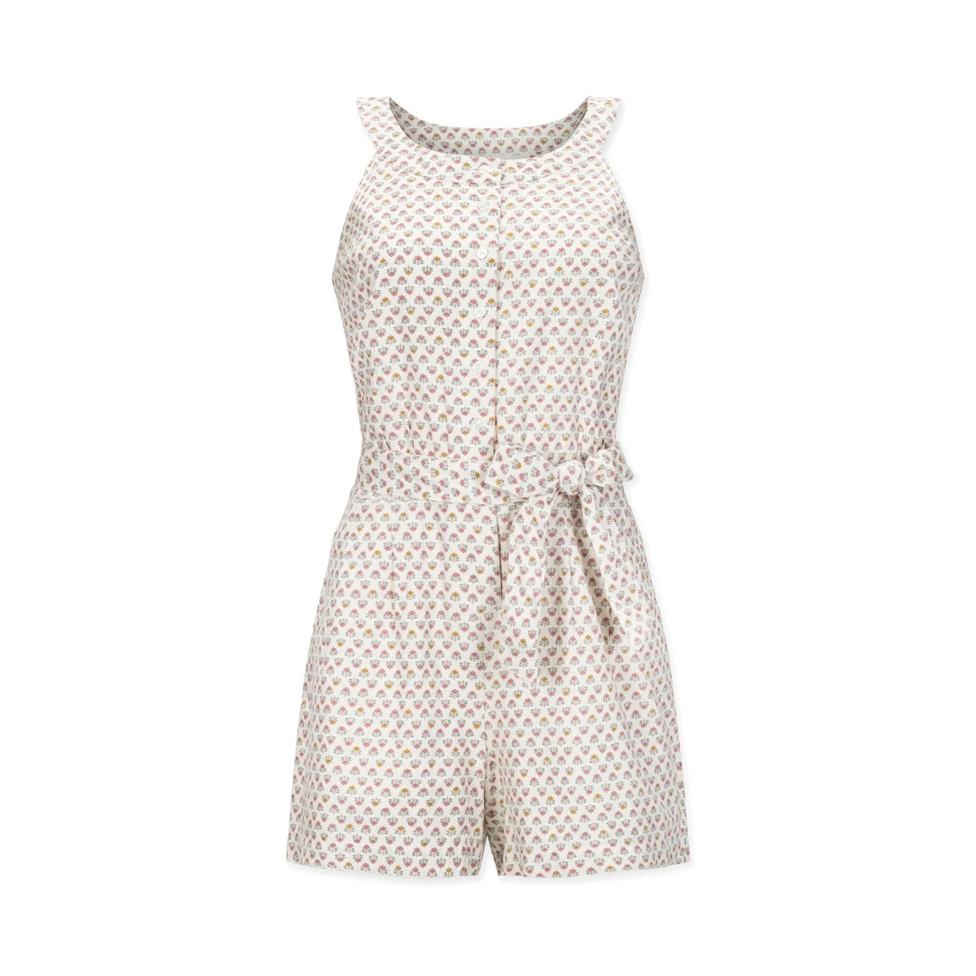 A flattering halter neckline elevates the beach-ready appeal of our breezy summer romper. Cut from our soft organic cotton and linen blend in a pretty woodblock print. Features a button front closure, elastic at the back waistband, and a removable waist sash for styling options. And did we mention - it has pockets?