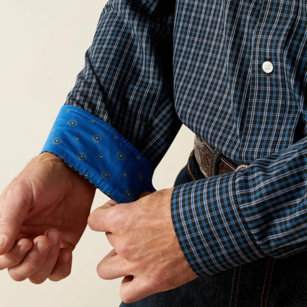 Men's Ariat black and blue plaid wrinkle free classic fit long sleeve western shirt, adjustable cuffs, button-front closure with buttoned collar points, 100% cotton