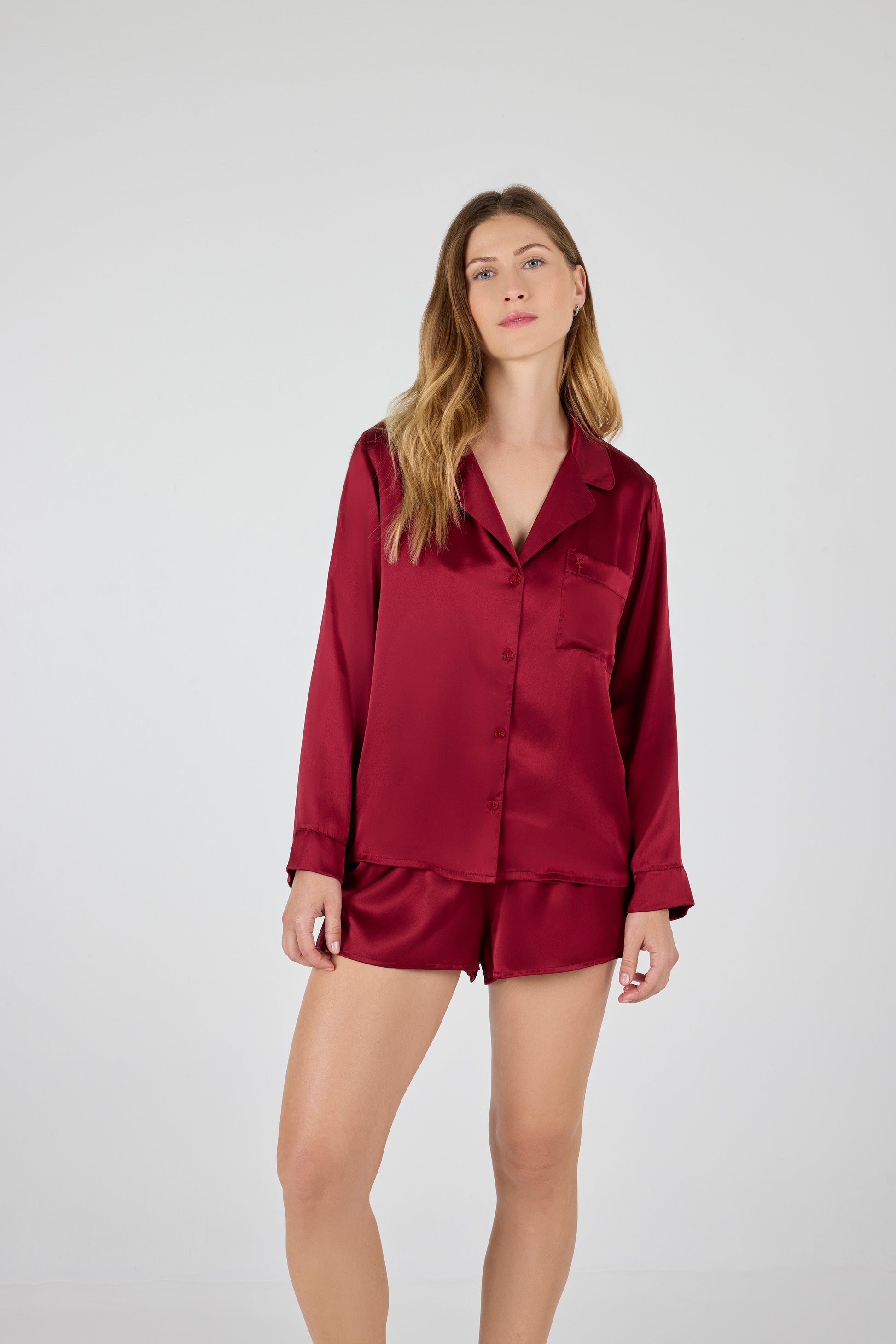 A forever staple, this silk pajama set pairs a classic button-up top with front pocket and paired with airy shorts for effortless style and comfort. The shorts feature subtle side slits and a comfortably stretchy waistband.