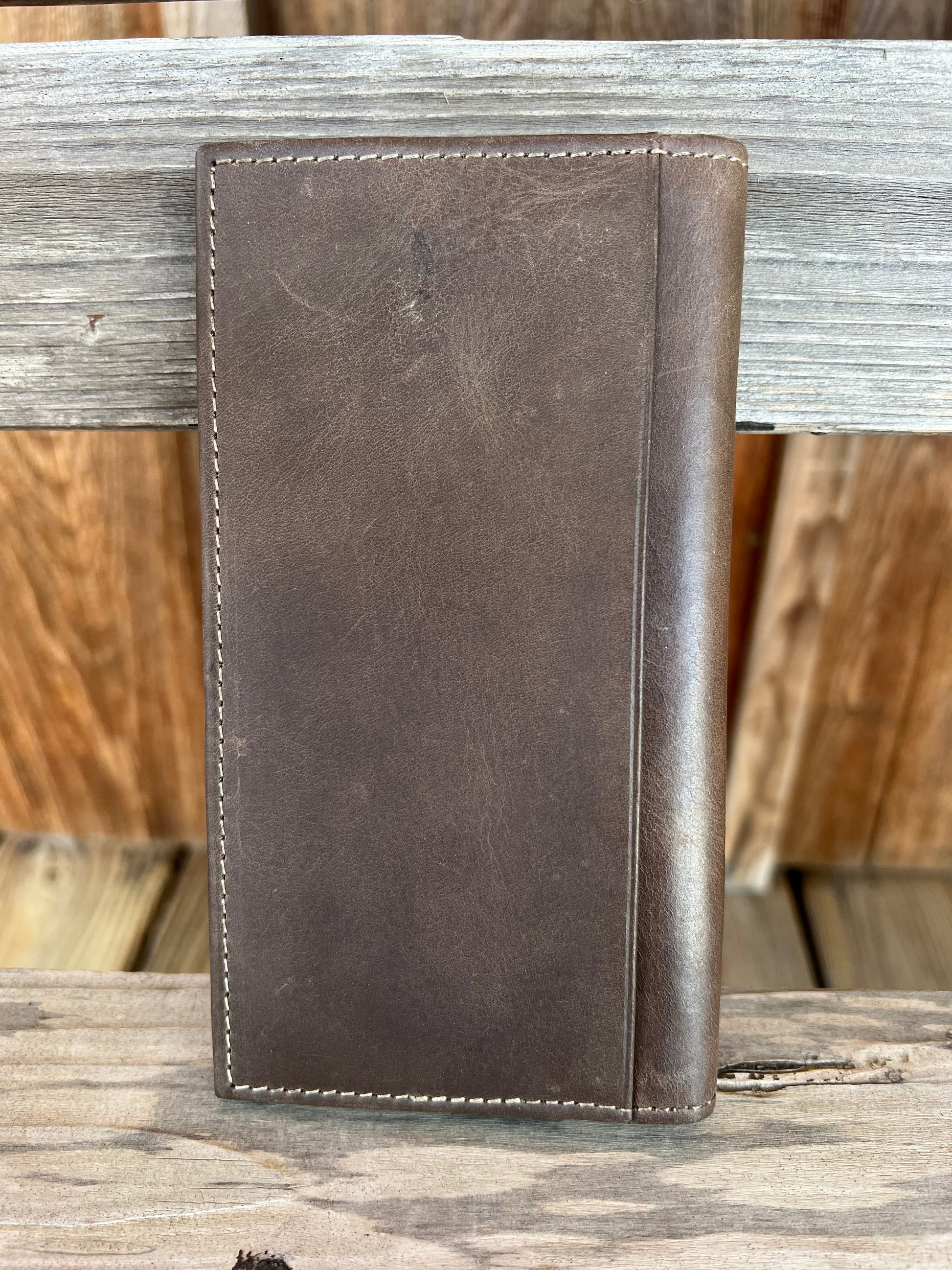 This Nocona genuine leather rodeo wallet has a floral tooled upper right corner. Beautifully accented with a braided leather edge.
