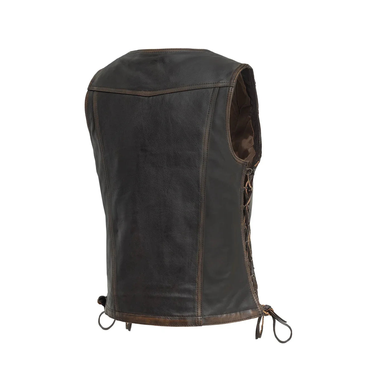 The Cindy is a V-Neck motorcycle vest crafted from premium light wait cow hide. It has D-Ring side laces, an armor pocket for a CE-2 rated back armor. The satin lining has easy access panels for adding patches or embroidery. This one is sure to get some attention!
