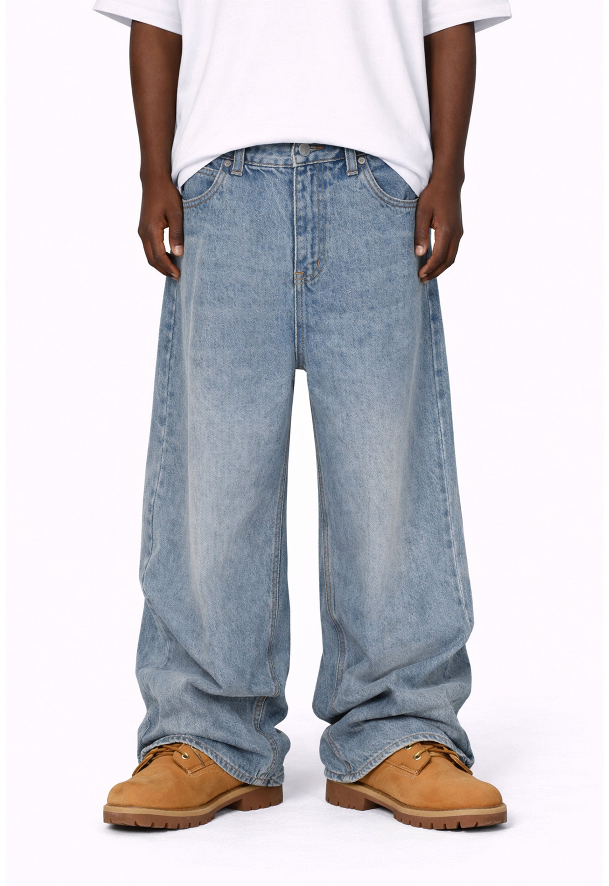 Our Classic Baggy Denim is constructed with a relaxed and straight fit, featuring a light vintage wash and traditional five-pocket denim details.