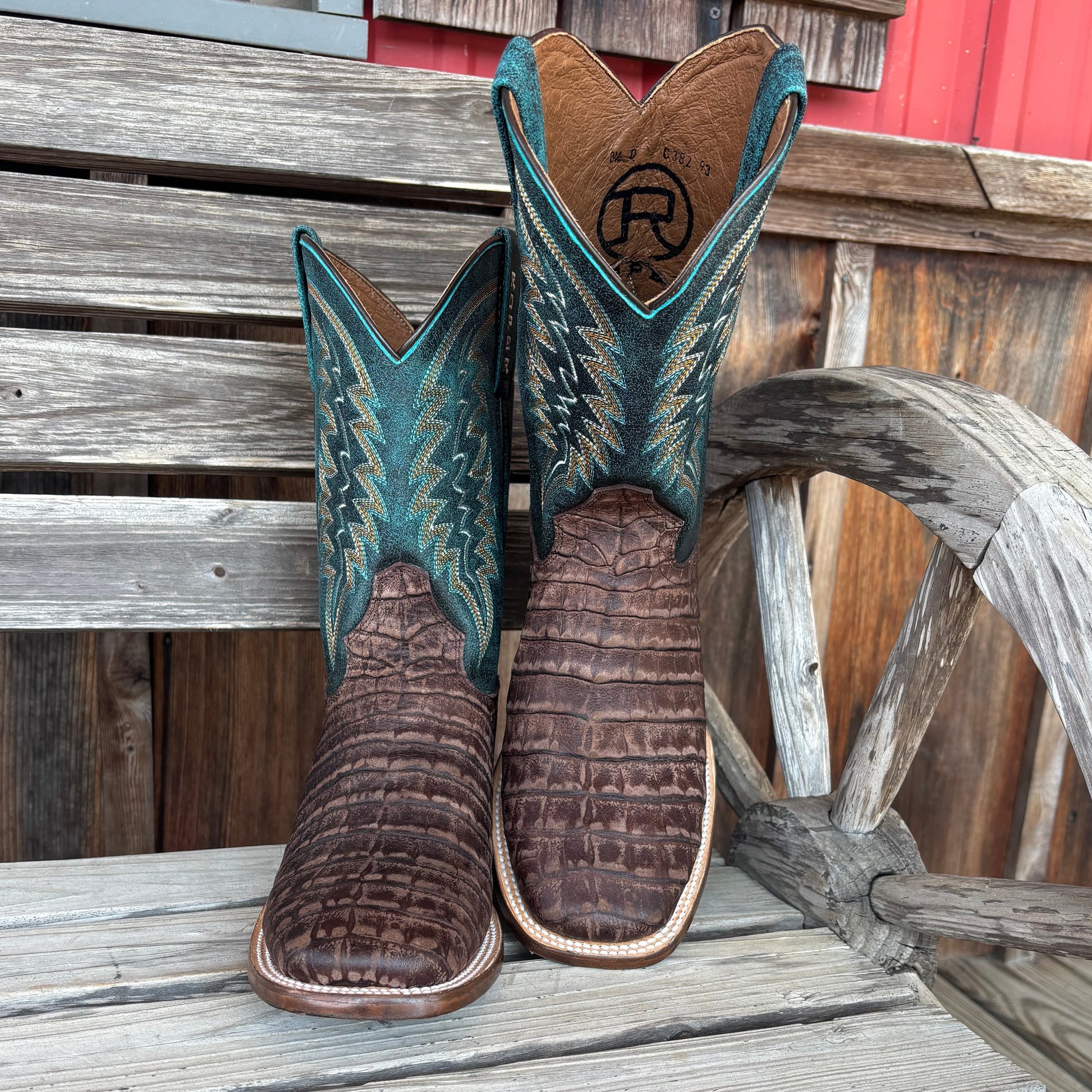 Men's Roper Square Toe Vintage Brown Embossed Caiman Vamp, Vintage Blue Leather Shaft, Double Welt, 11" Shaft, All Leather Lining, Leather Walking Heel, Leather Sole, REST Removeable Insole * ¾ Welt Sole W/Nails & Lemonwood Pegs, Handcrafted Boot
