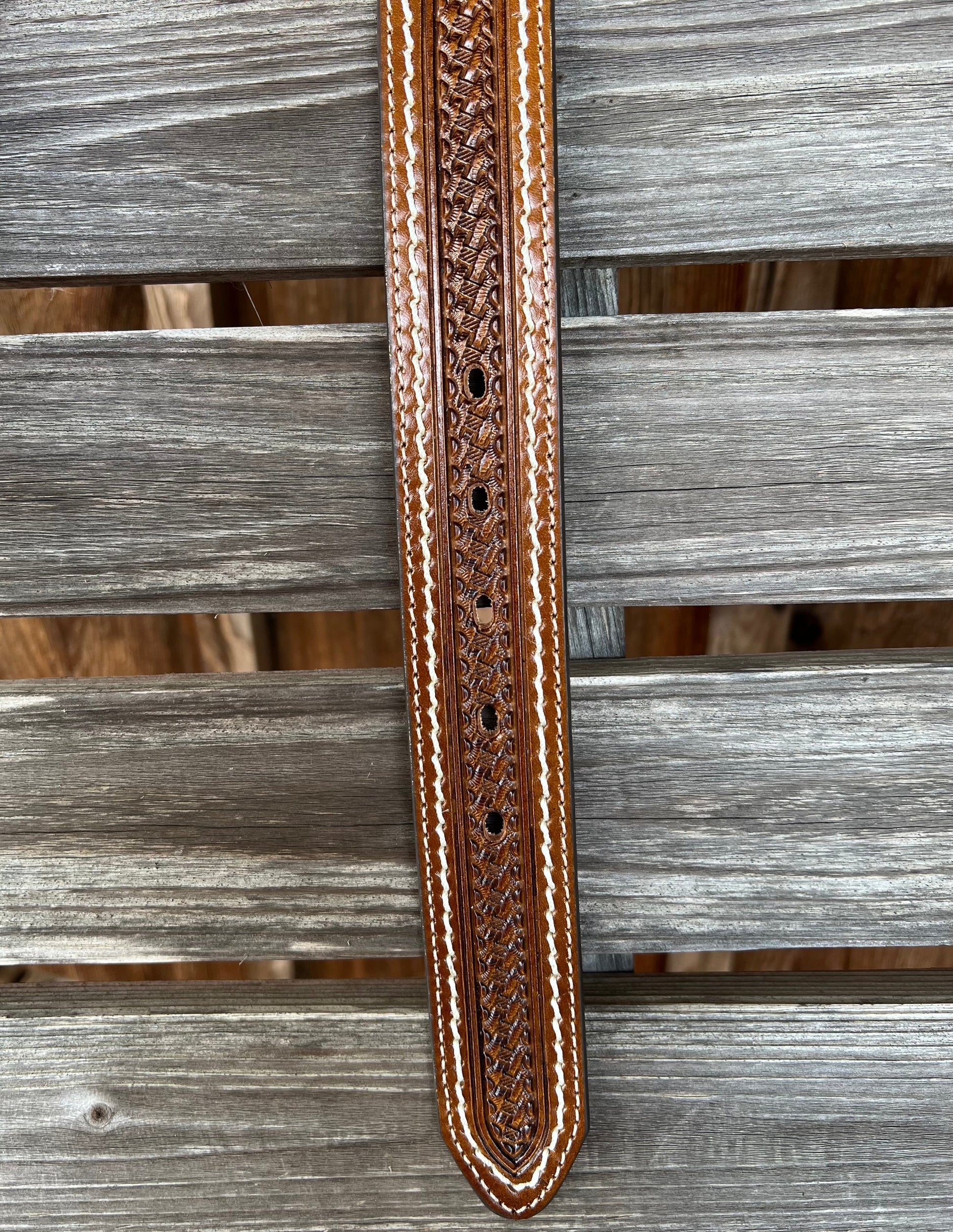 Tony Lama 1.5" Men's belt "Cross Creek". Tan basketweave with 2 oval silver conchos and white stitching