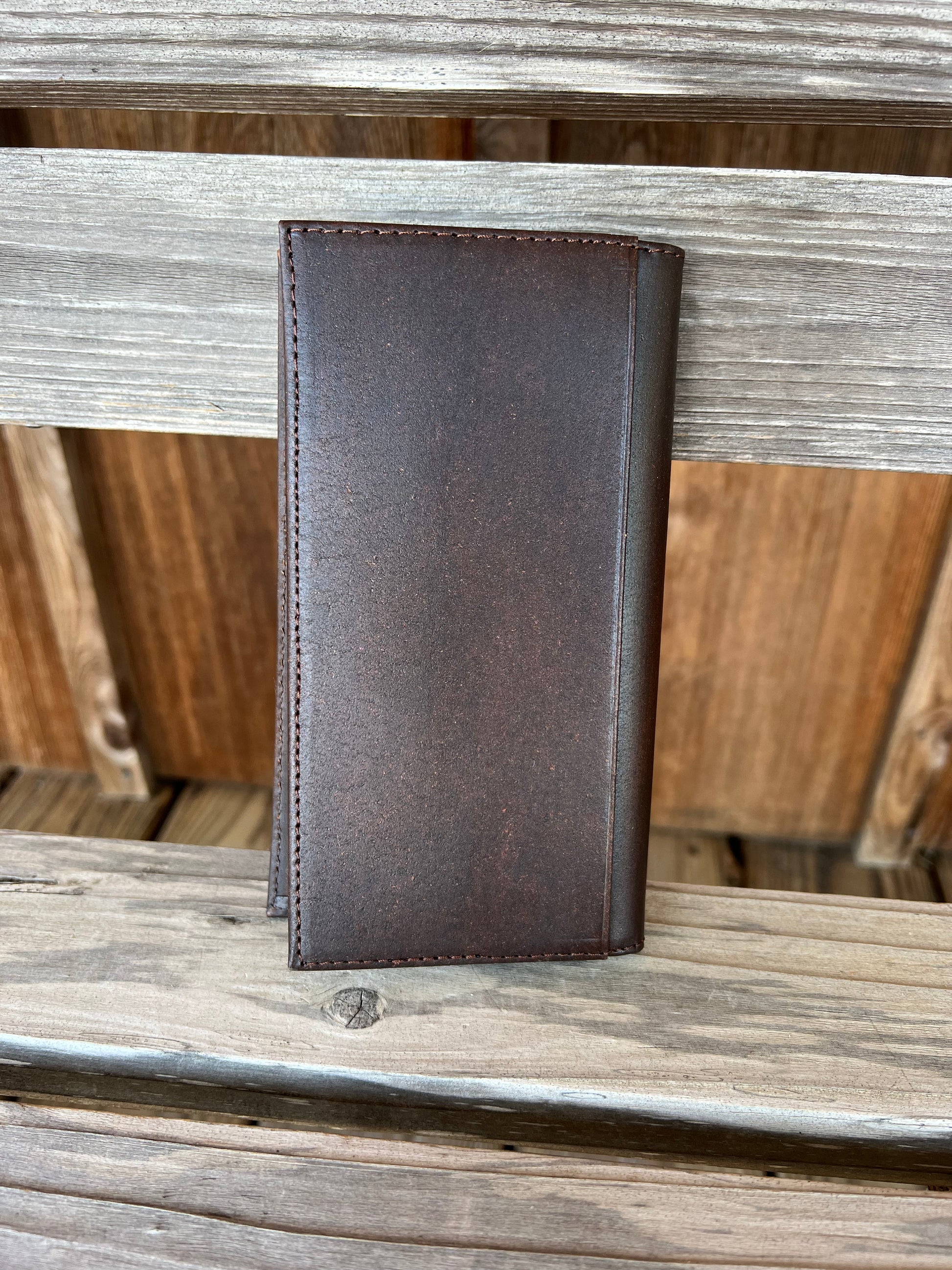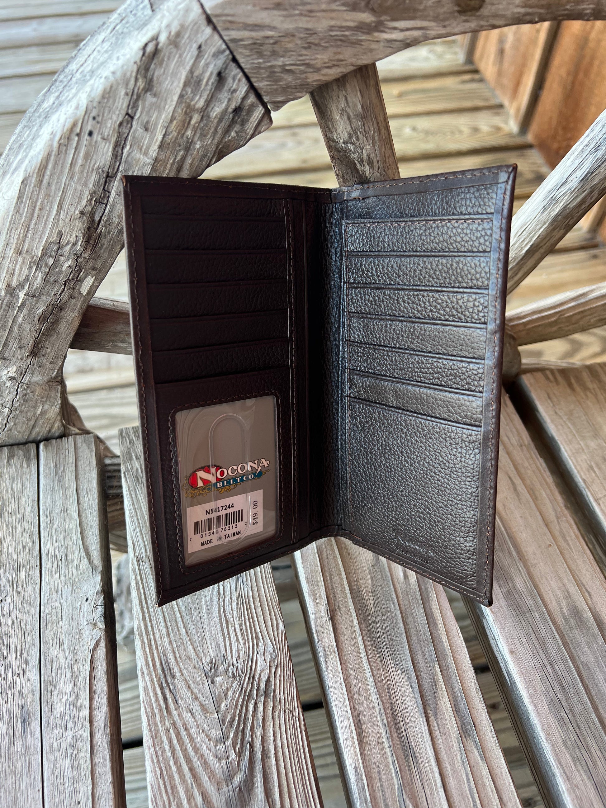 This Nocona rodeo wallet by M&F Western Products is genuine leather and has a Cross and a scrolling pattern embossed on the front. Checkbook, cash and card slots inside.