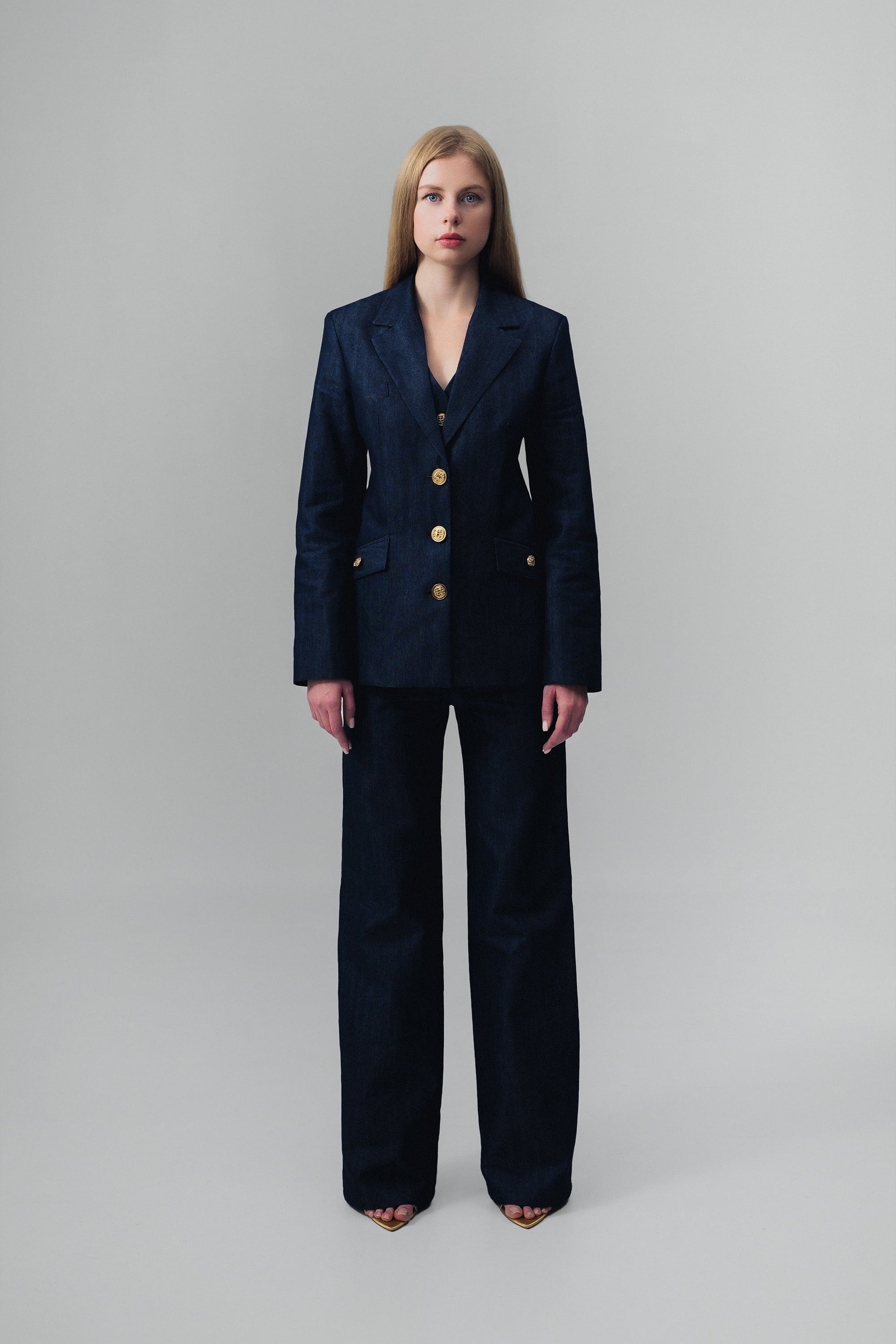 The Demi Denim Suit Blazer elevates classic tailoring with rich navy denim, offering a timeless silhouette with modern polish. Three gold-tone buttons and a smooth satin lining enhance its refined structure, while clean front pockets provide practical functionality.