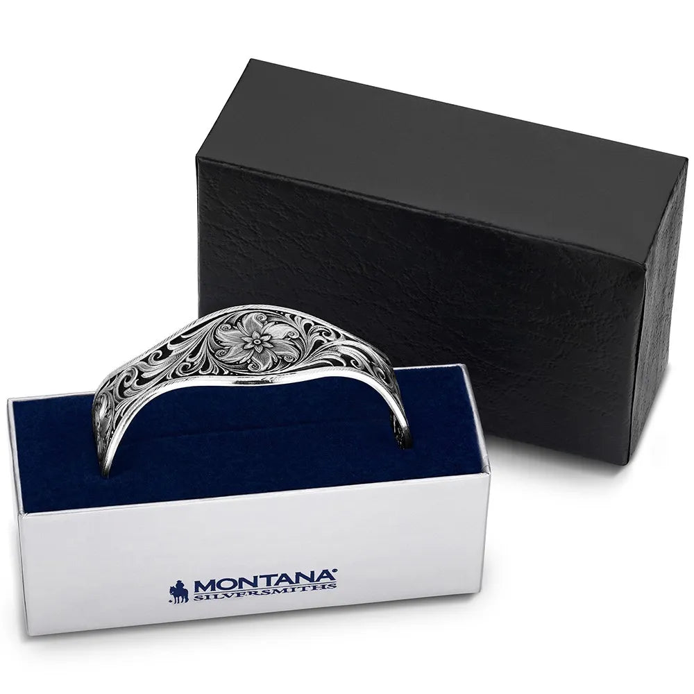 The Desert Marigold Floral Cuff Bracelet is a Southwest inspired cuff brings soft floral accents to any outfit. The scroll pattern is complemented by contrasting black features and scalloped edge design. Silver over brass. Paint. Montana Armor to prevent tarnish.
