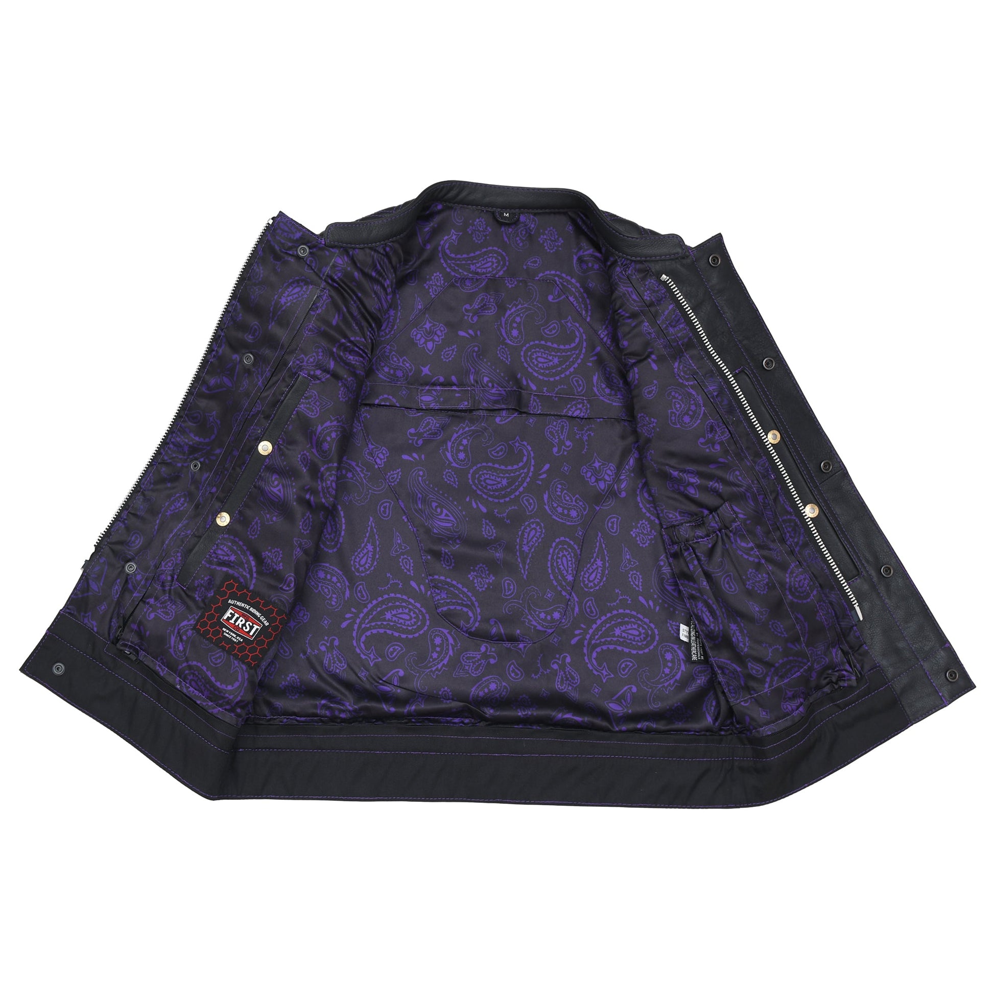 The Downside is an all leather club style vest, that fits just like our Sharpshooter and other standard club vests. It's got a one-inch collar, and cropped center zipper for comfort while sitting on the bike. A mesh lining keeps you comfortable, and also has an easy access zip so you can easily add patches or embroideries. And of course, it's got our conceal carry pockets!
