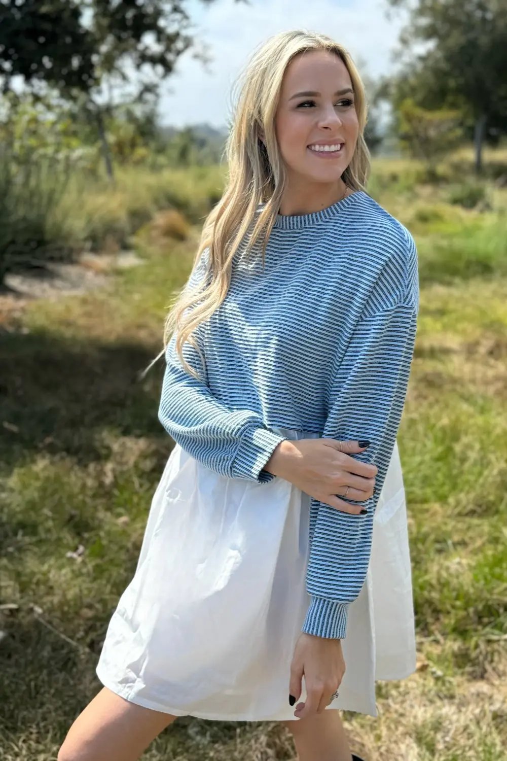 Dress - Blue Stripe Pleated High Waist - Daily Casual