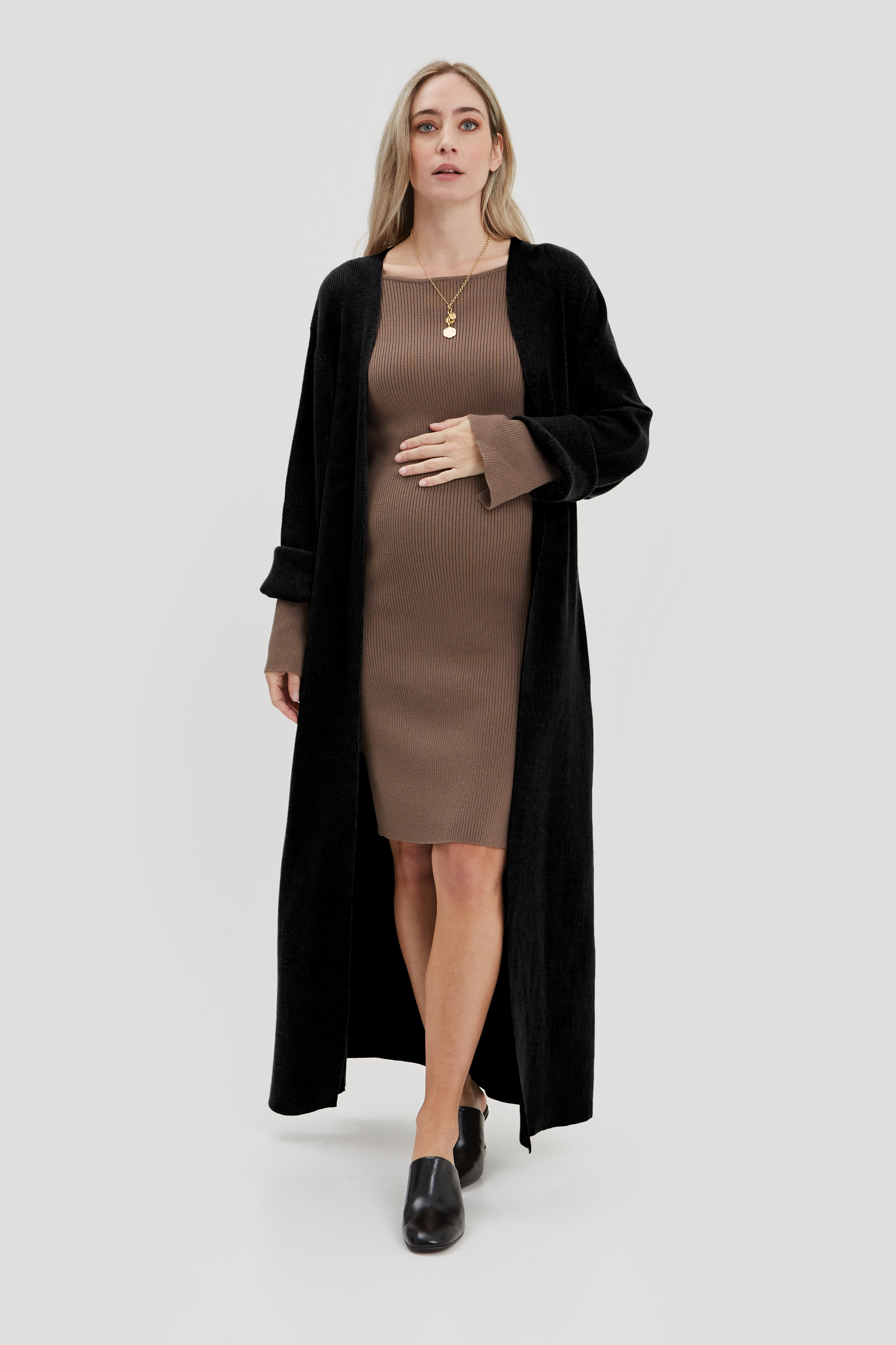 A maxi-length knit made from 100% recycled ribbed yarn, the Emaline Cardigan is the cozy layer you’ll live in. With its soft drape, tie belt, and wear-with-everything ease, it’s the perfect staple for chillier days and every stage of motherhood.