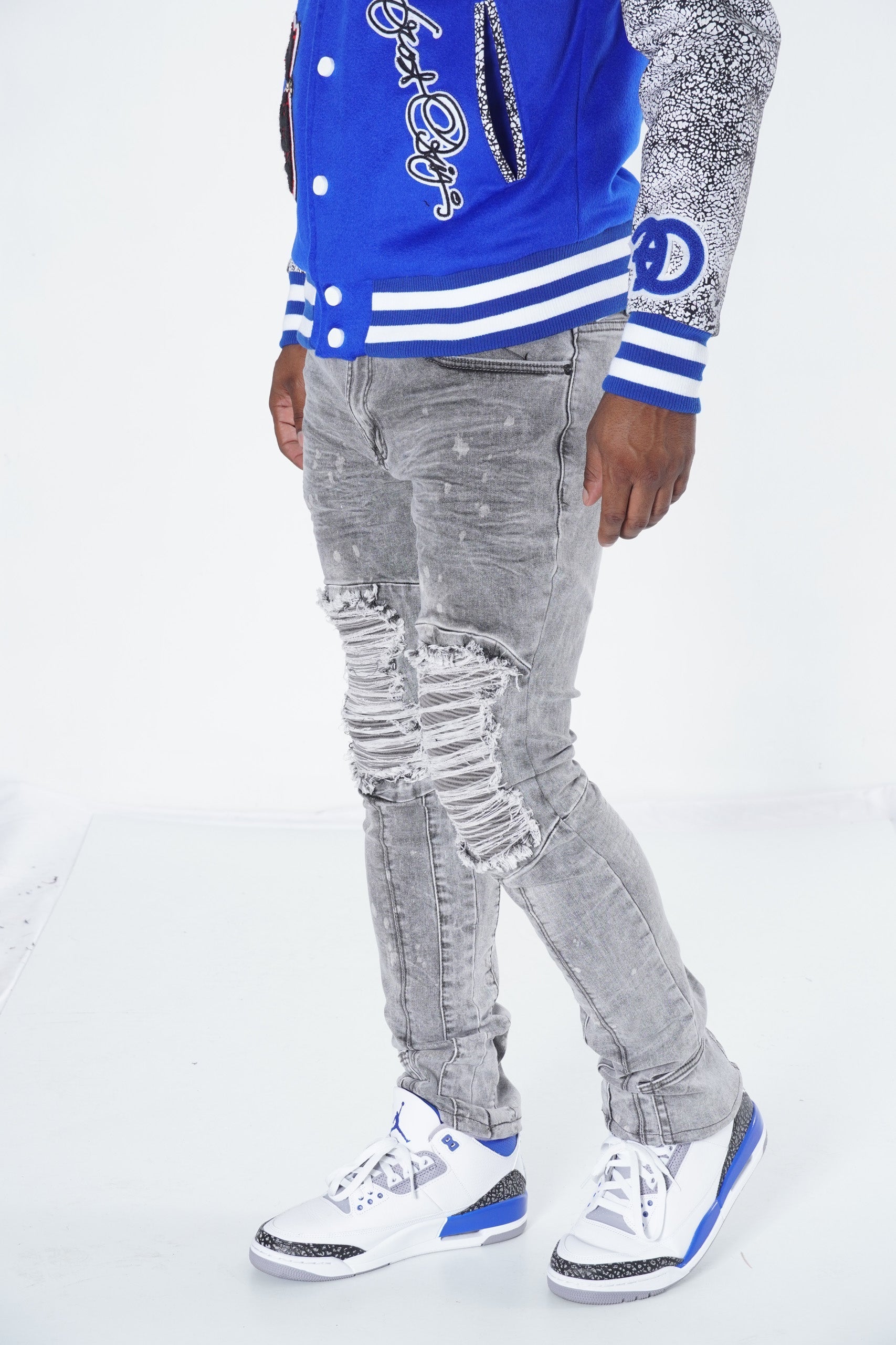 F1748A Shredded Biker Denim Jeans w/ Bottom Leg Zipper | 32-inch Inseam - Gray