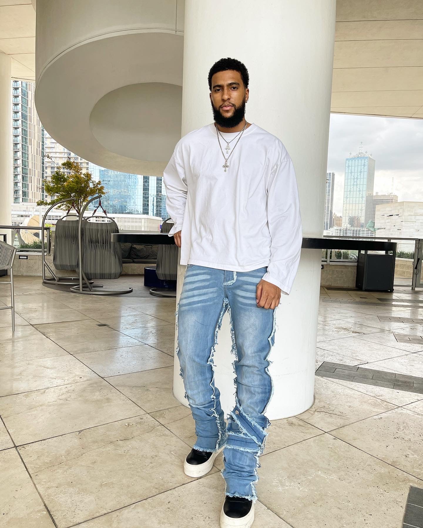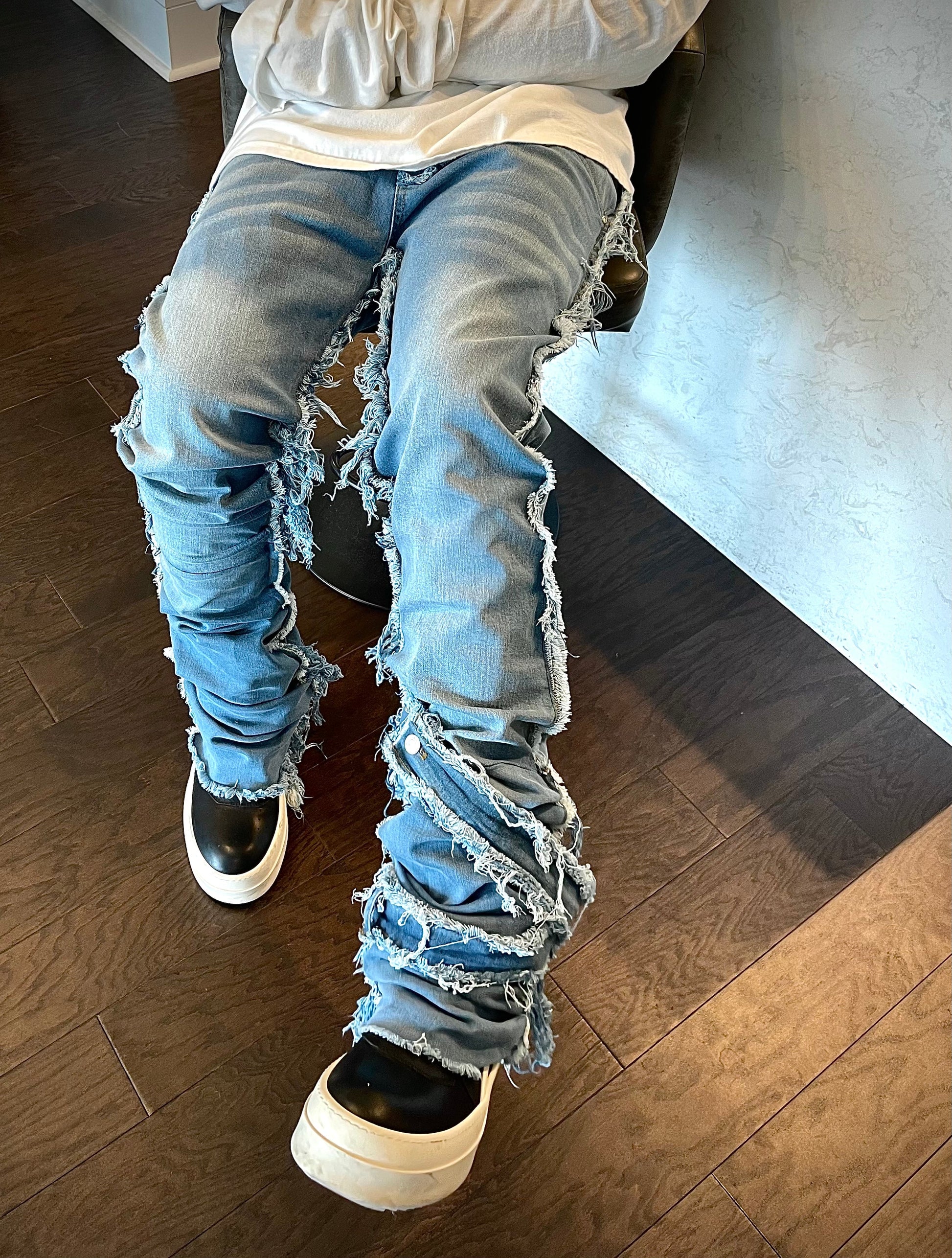 Faded Blue Stacked Furry Denim w/ Shin Belt