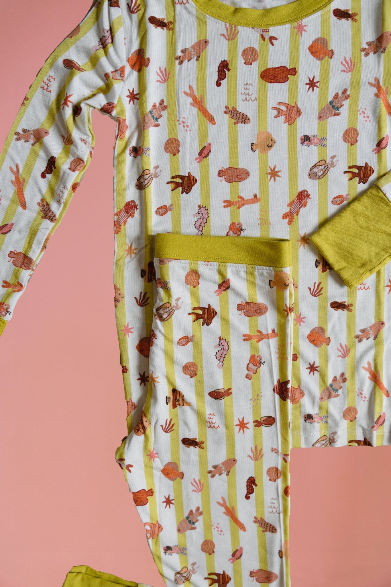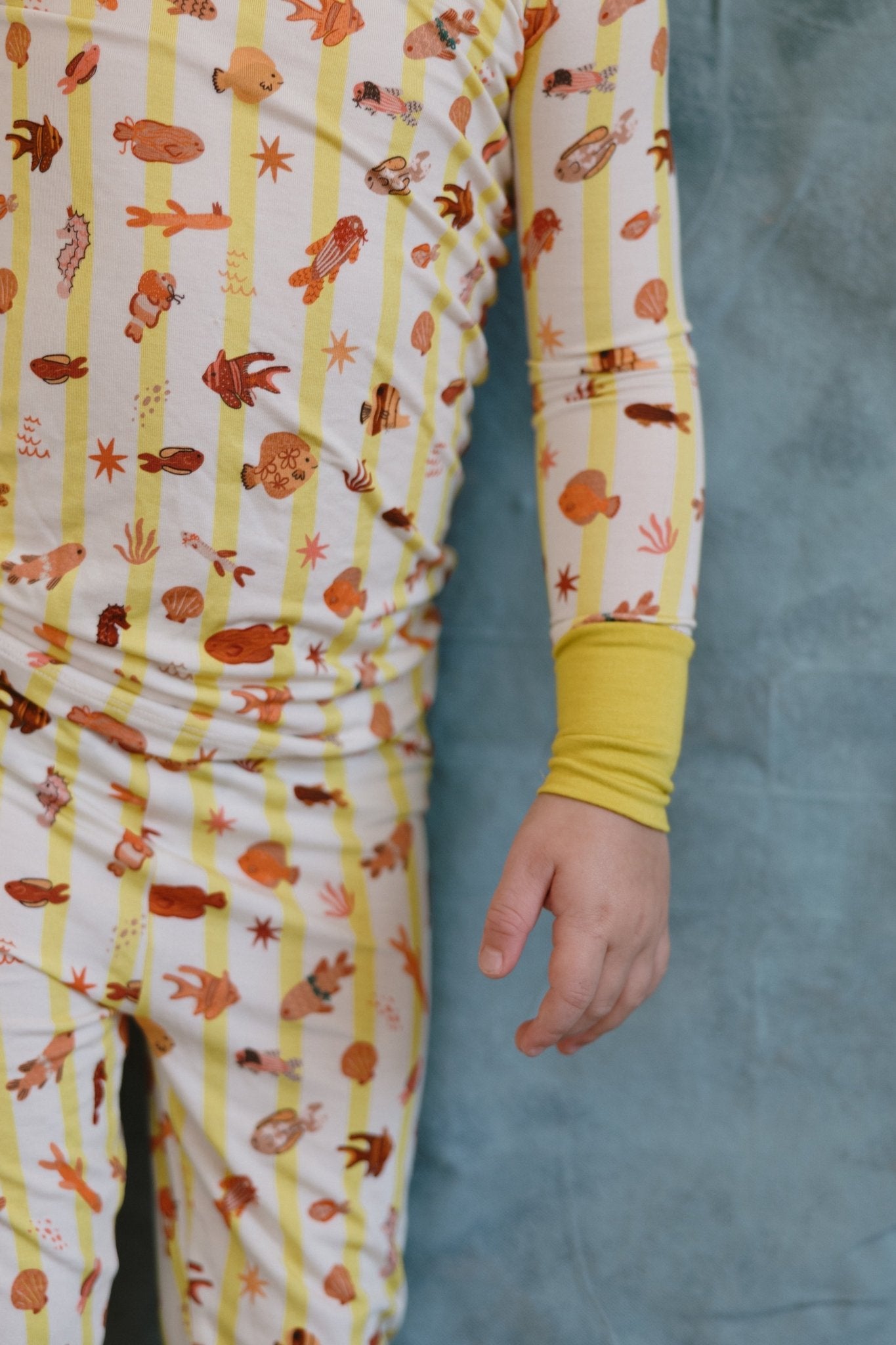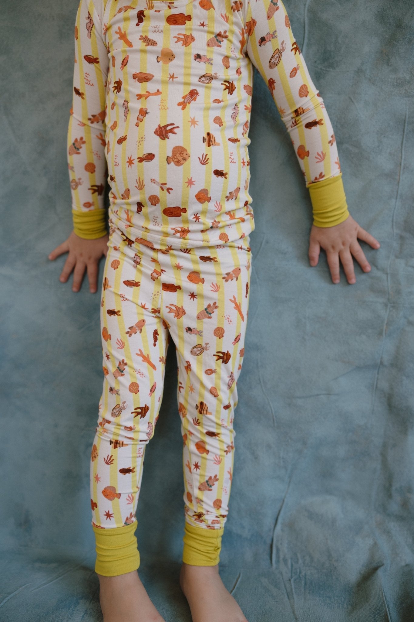 Our Fancy Fins Two-Piece Bamboo Pajama Set are made for dreamy seas and fancy fish lovers. Featuring our yellow stripe with fish print, this long-sleeve top and matching pants set is crafted from a premium blend of 95% viscose from bamboo and 5% spandex — breathable, buttery-soft, and stretchy for nonstop comfort.
